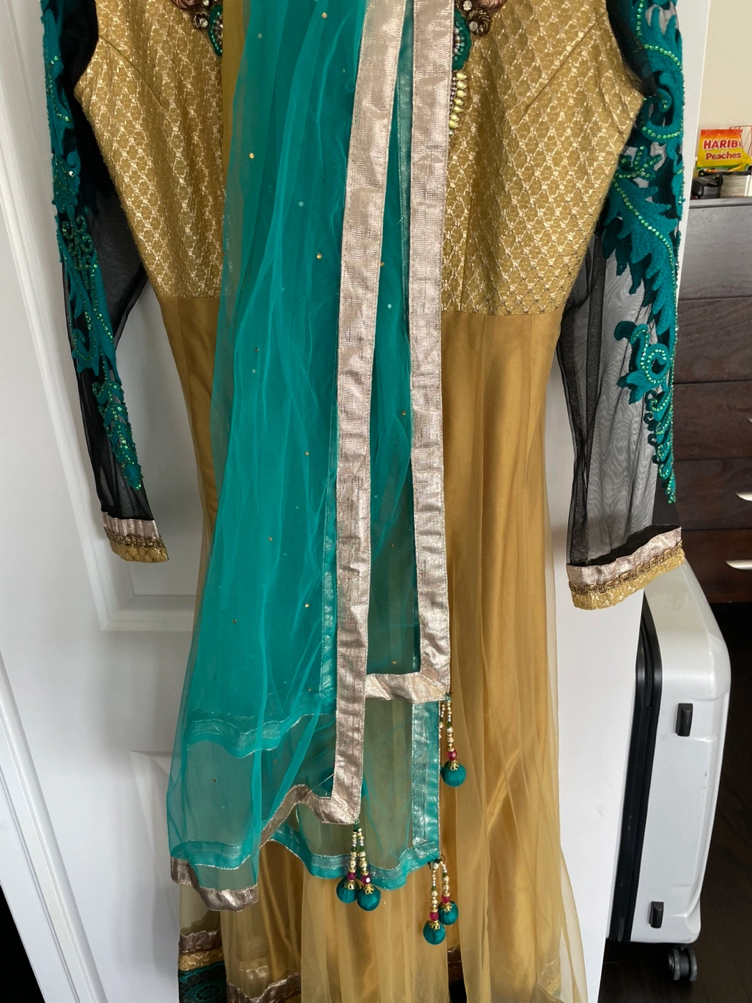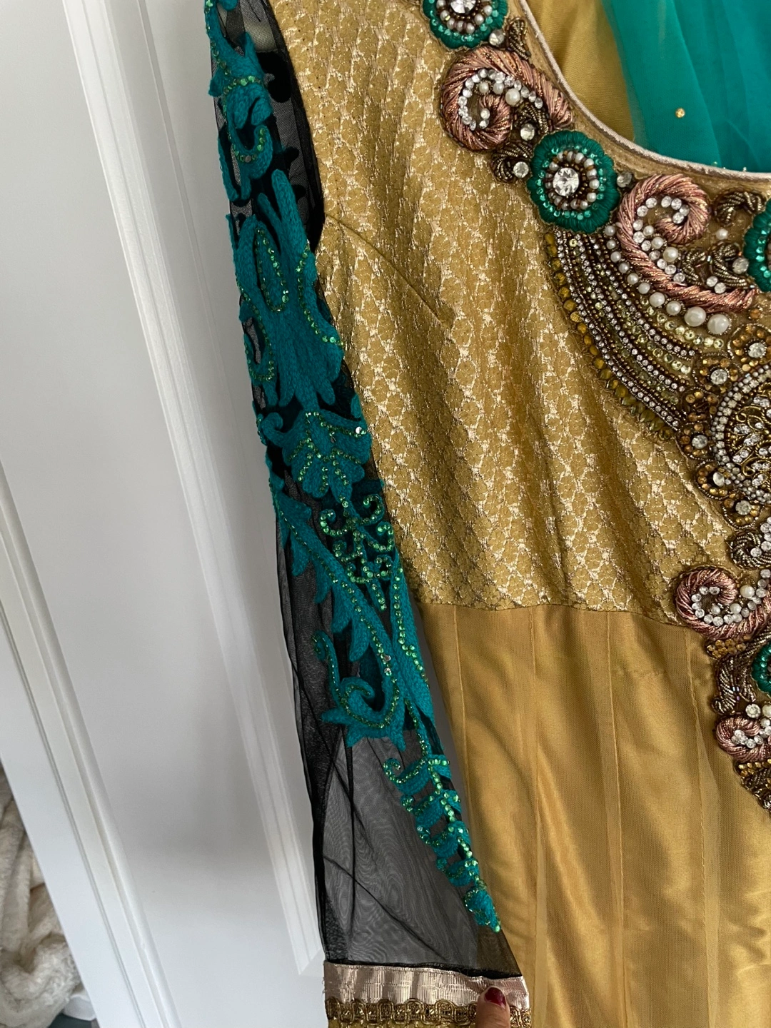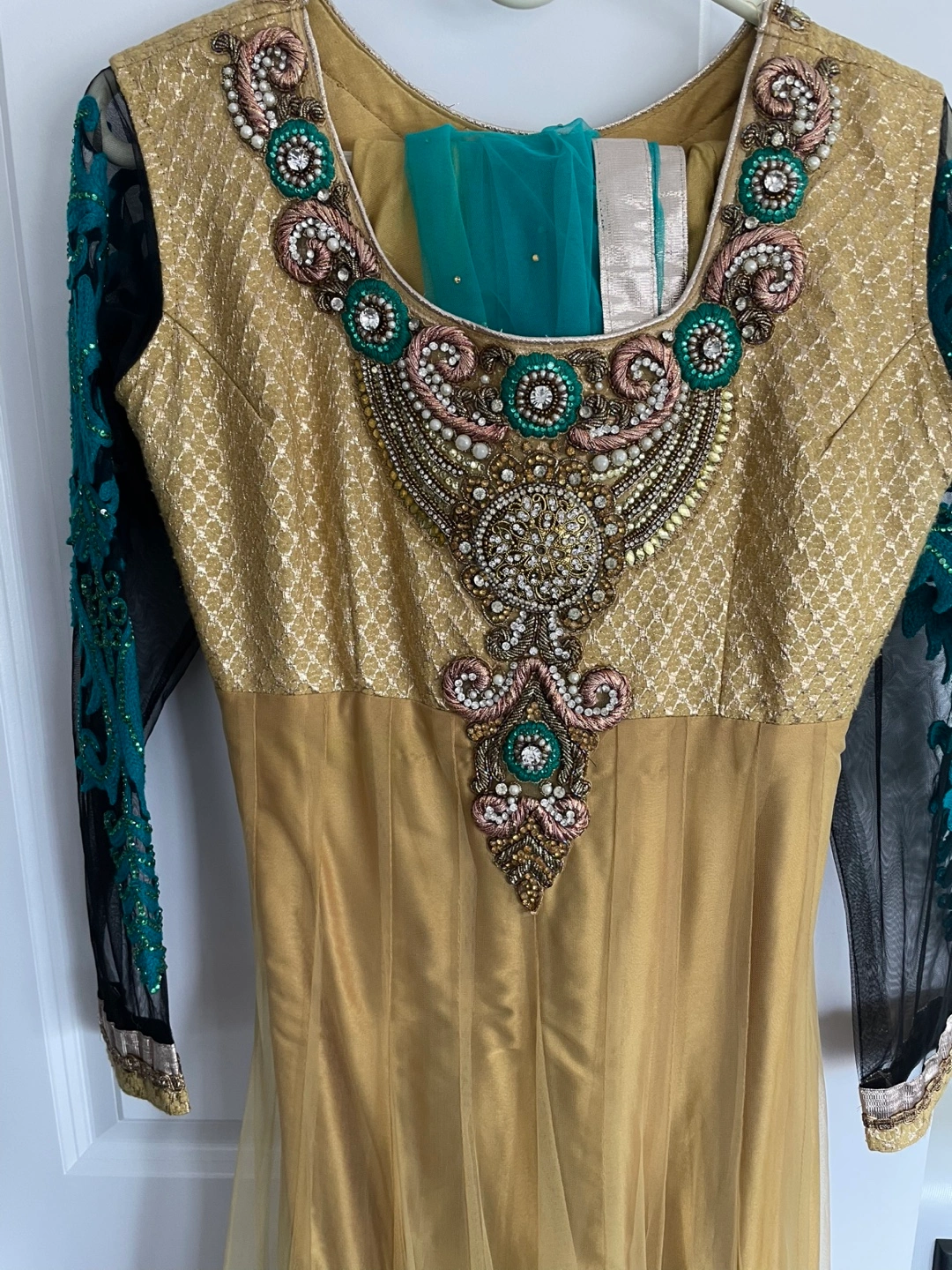 Beautiful gold and teal shalwar kameez. Intricate embroidery detail. Long sleeves. Includes matching dupatta.
