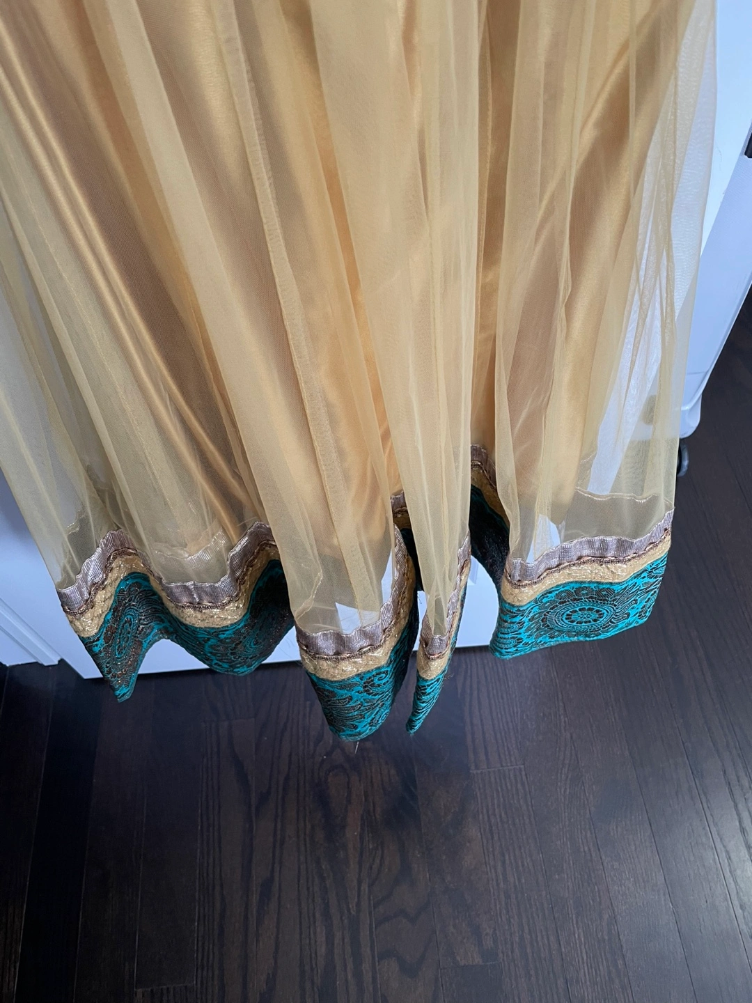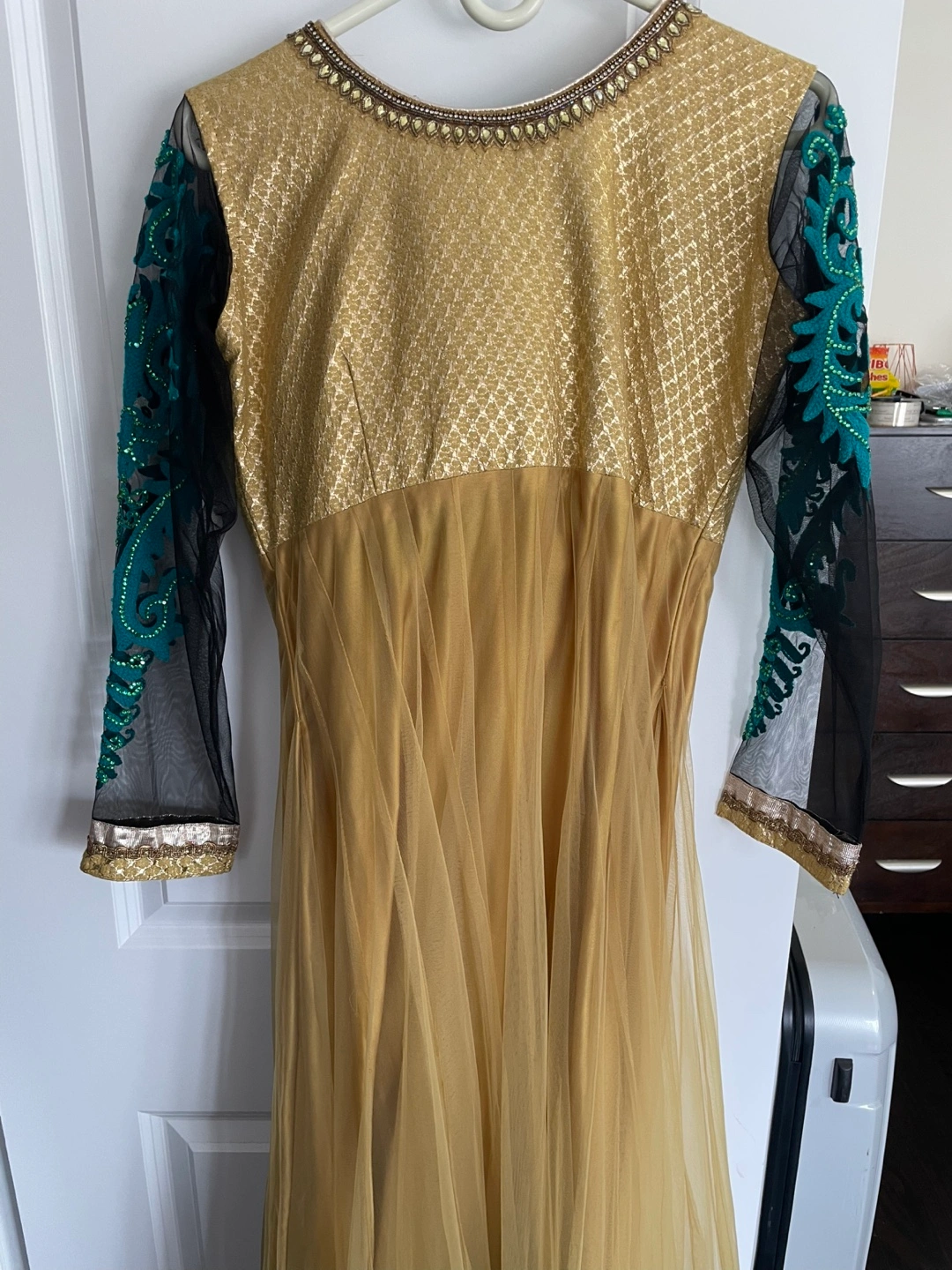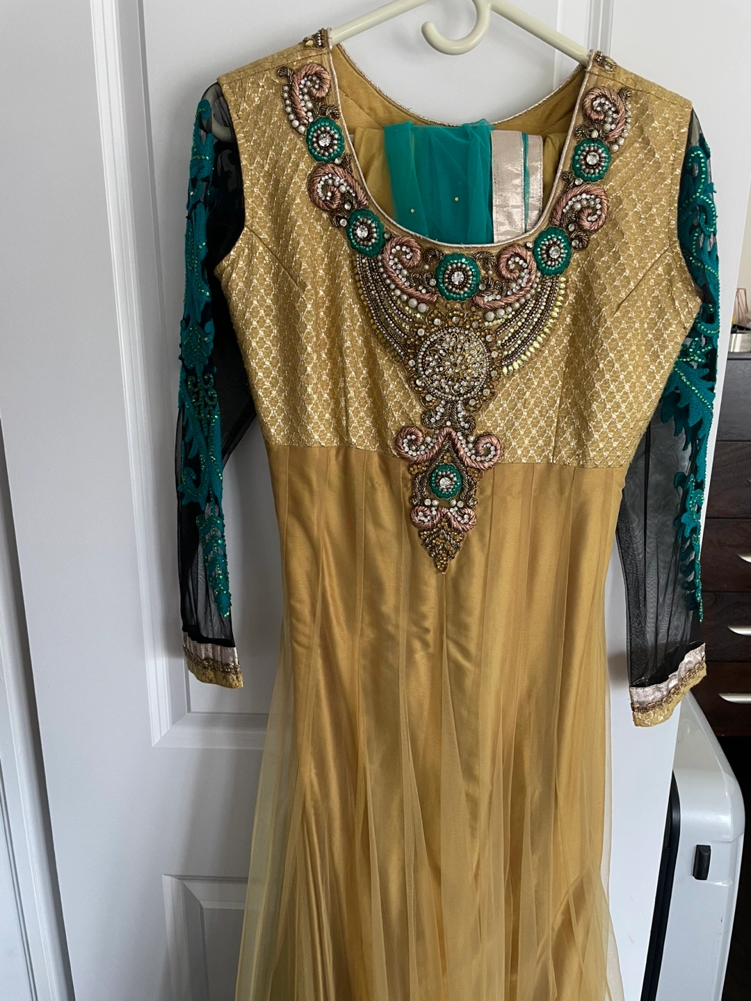 Beautiful gold and teal shalwar kameez. Intricate embroidery detail. Long sleeves. Includes matching dupatta.