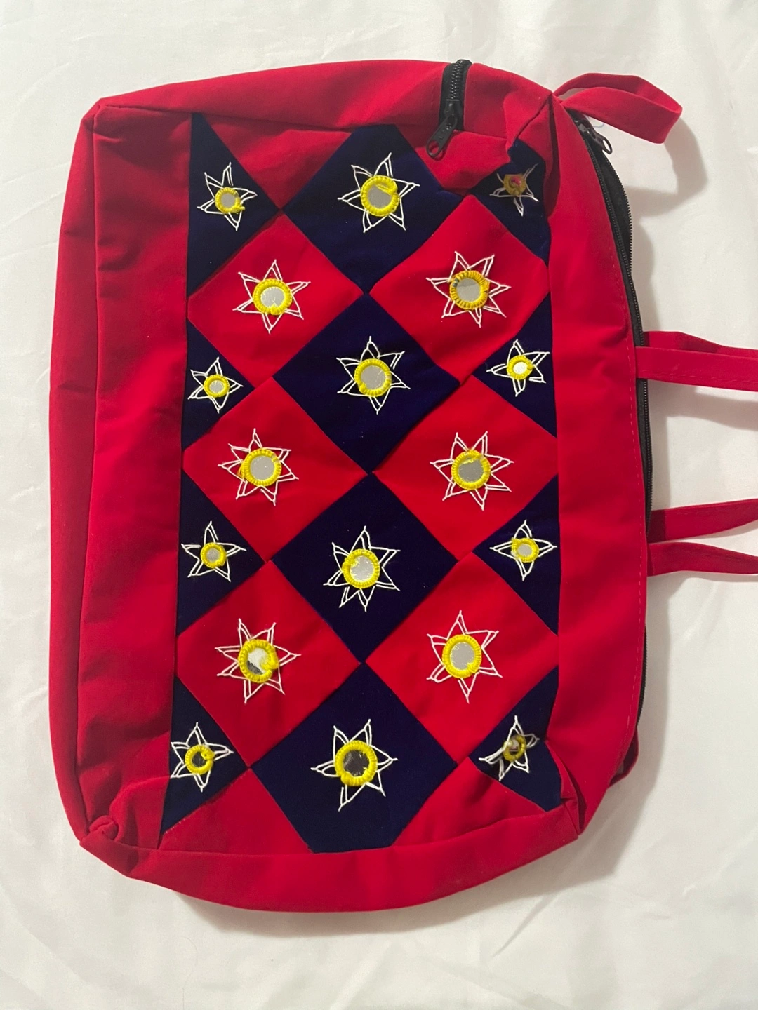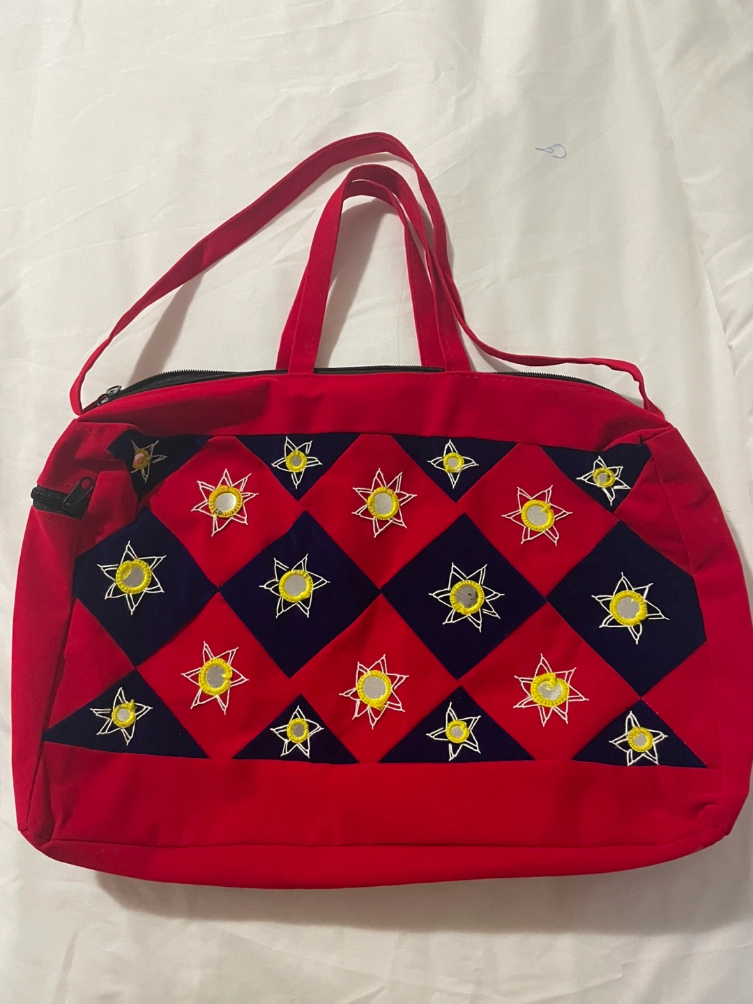 Large tote bag. Red and blue patterned fabric. Features embroidered stars and mirror accents. Top zip closure. Two top handles and a long shoulder strap.