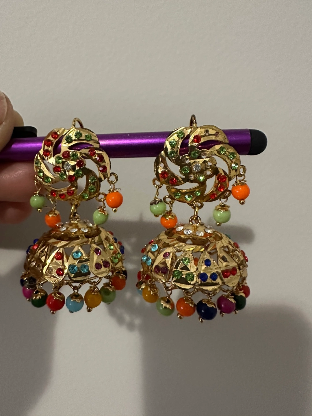 Three pairs of beautiful earrings. One pair features ornate detailing and colourful stones. Another pair has a circular design with green and brown accents. The third pair boasts a vibrant, multicoloured design with jhumka-style detailing.