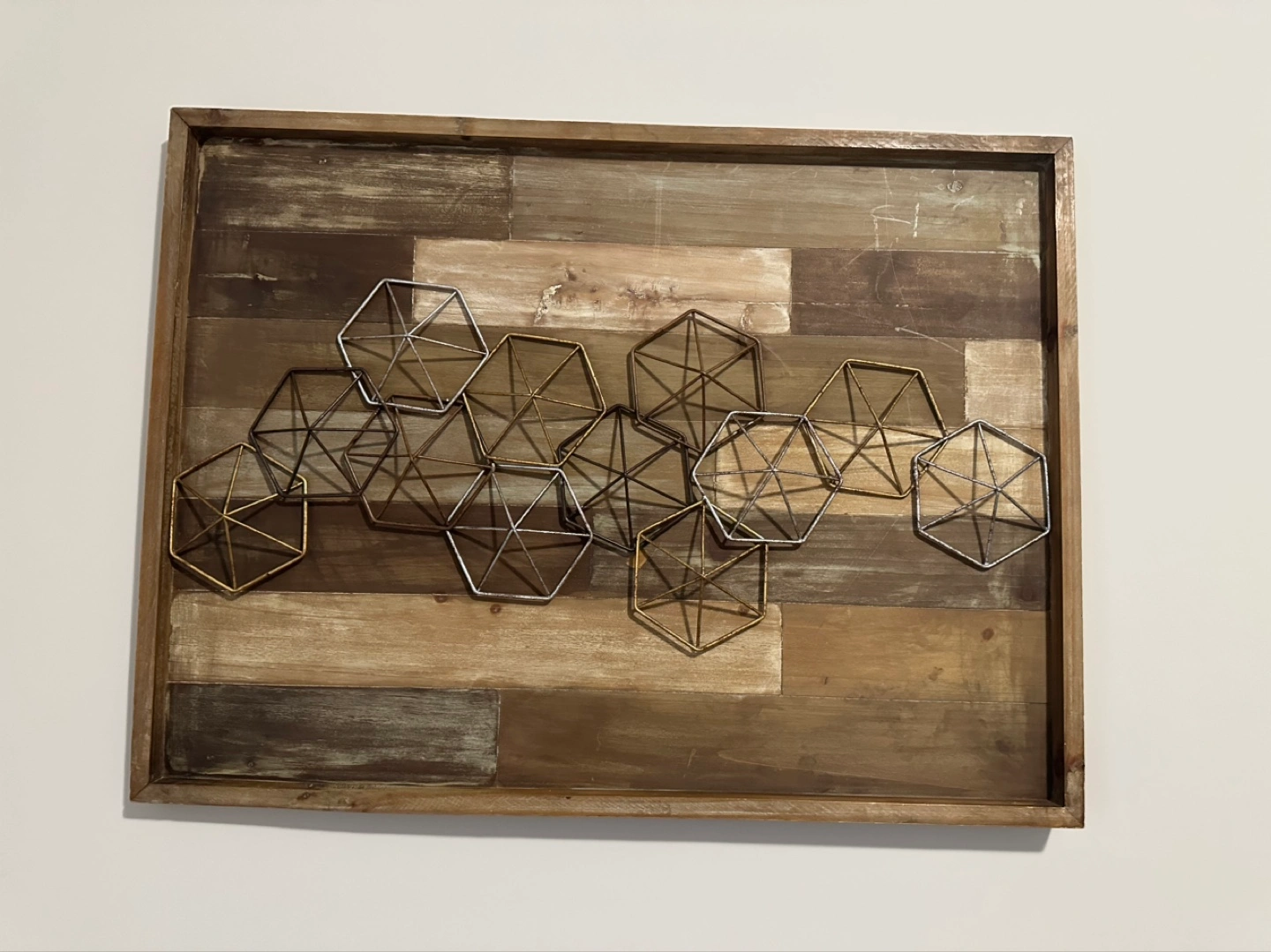 Beautiful wall hanging. Features geometric metal shapes on a rustic wood background. Adds a modern farmhouse touch to any room. Great for living room or bedroom.