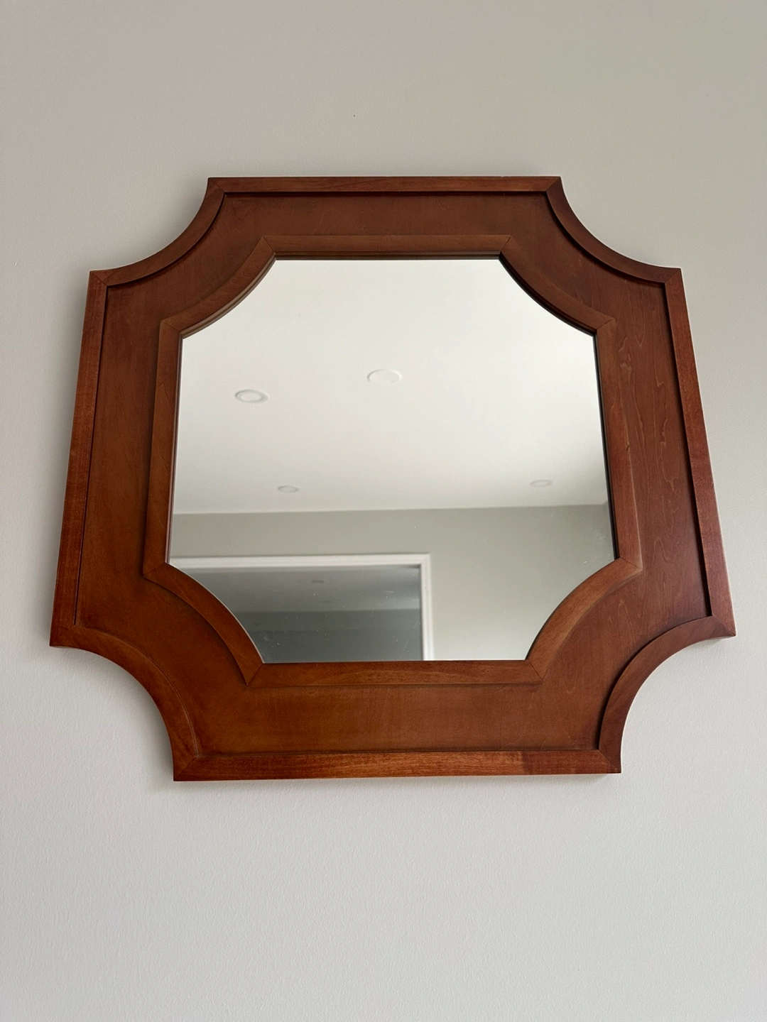 Beautiful octagonal mirror. Features a dark brown wood frame. Perfect for adding a touch of elegance to any room. Wall-mounted.