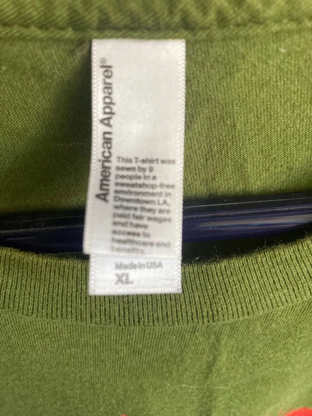 Green T-shirt. Features a graphic on the front and back. Size XL. American Apparel brand.