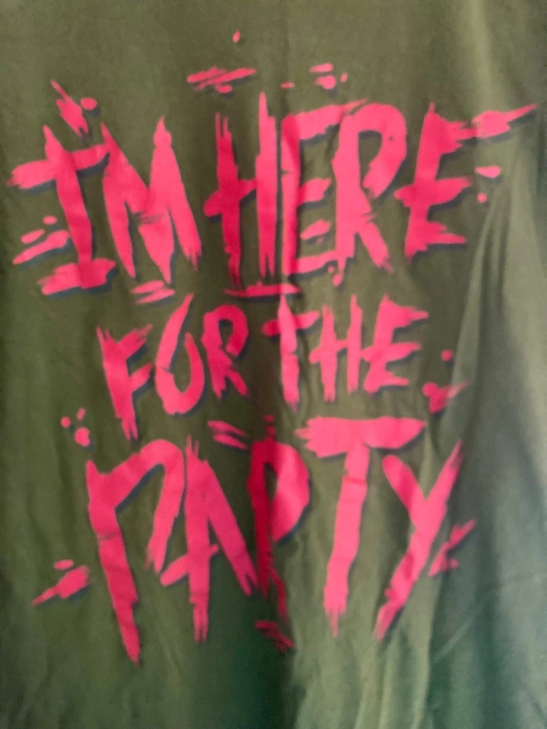 Rock this American Apparel olive green T-shirt, size XL, with a bold 'I'm here for the party' graphic in bright pink! It's got a fun 'Plugyourholes' logo on the back. This shirt is in used condition, ready to bring some fun to your wardrobe.