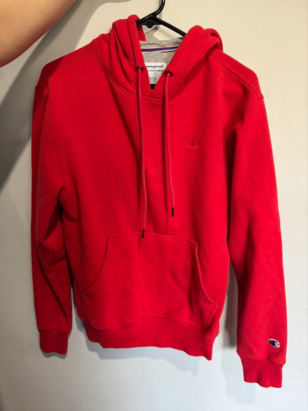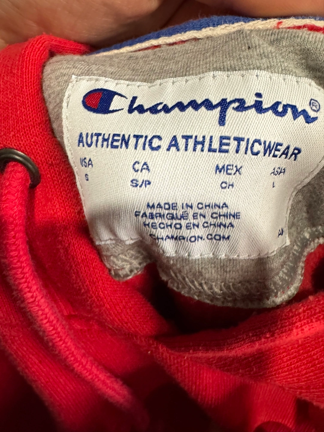 90Red Champion hoodie. Small size. Good condition. Features a front pouch pocket and drawstring hood.
