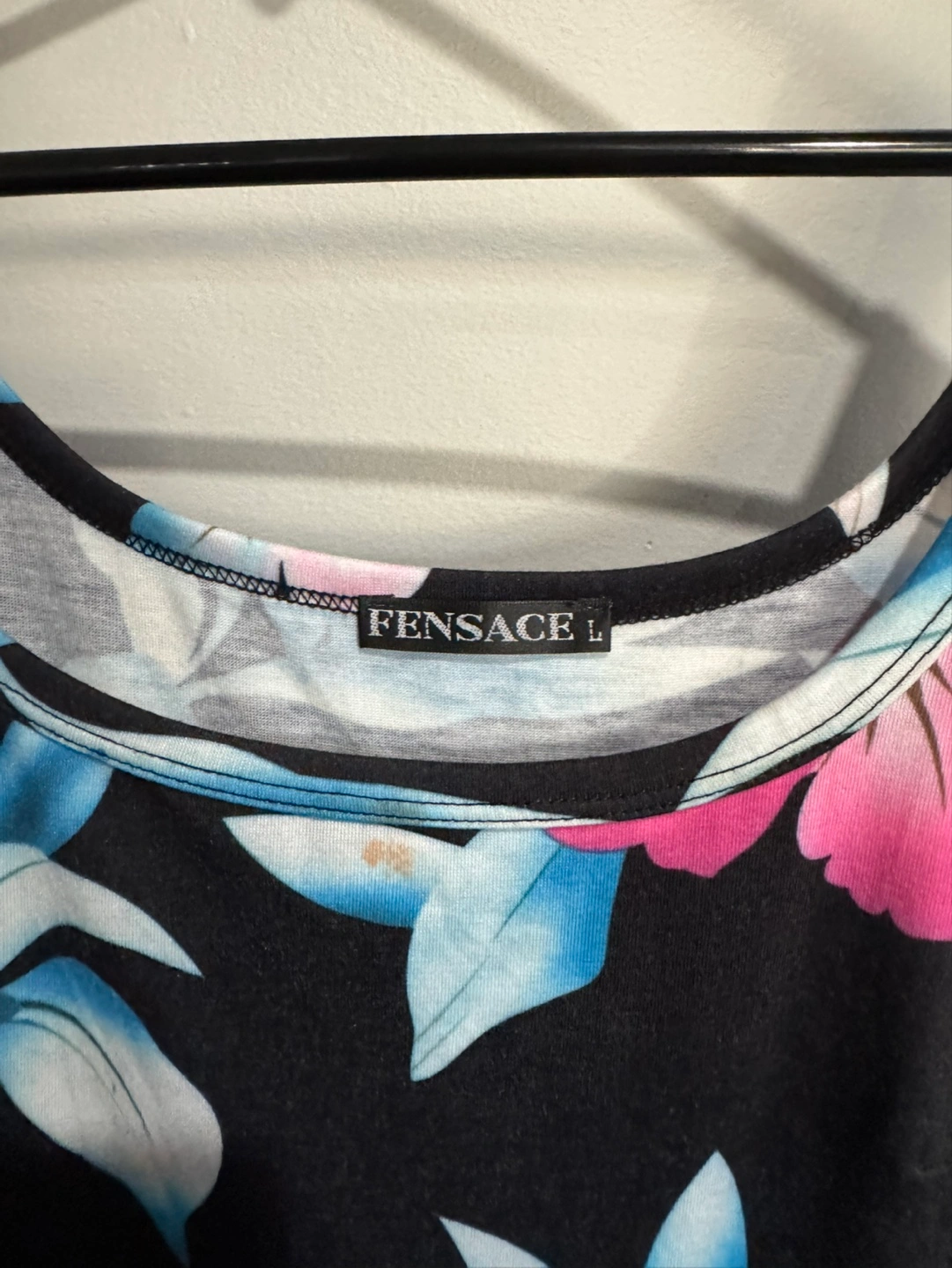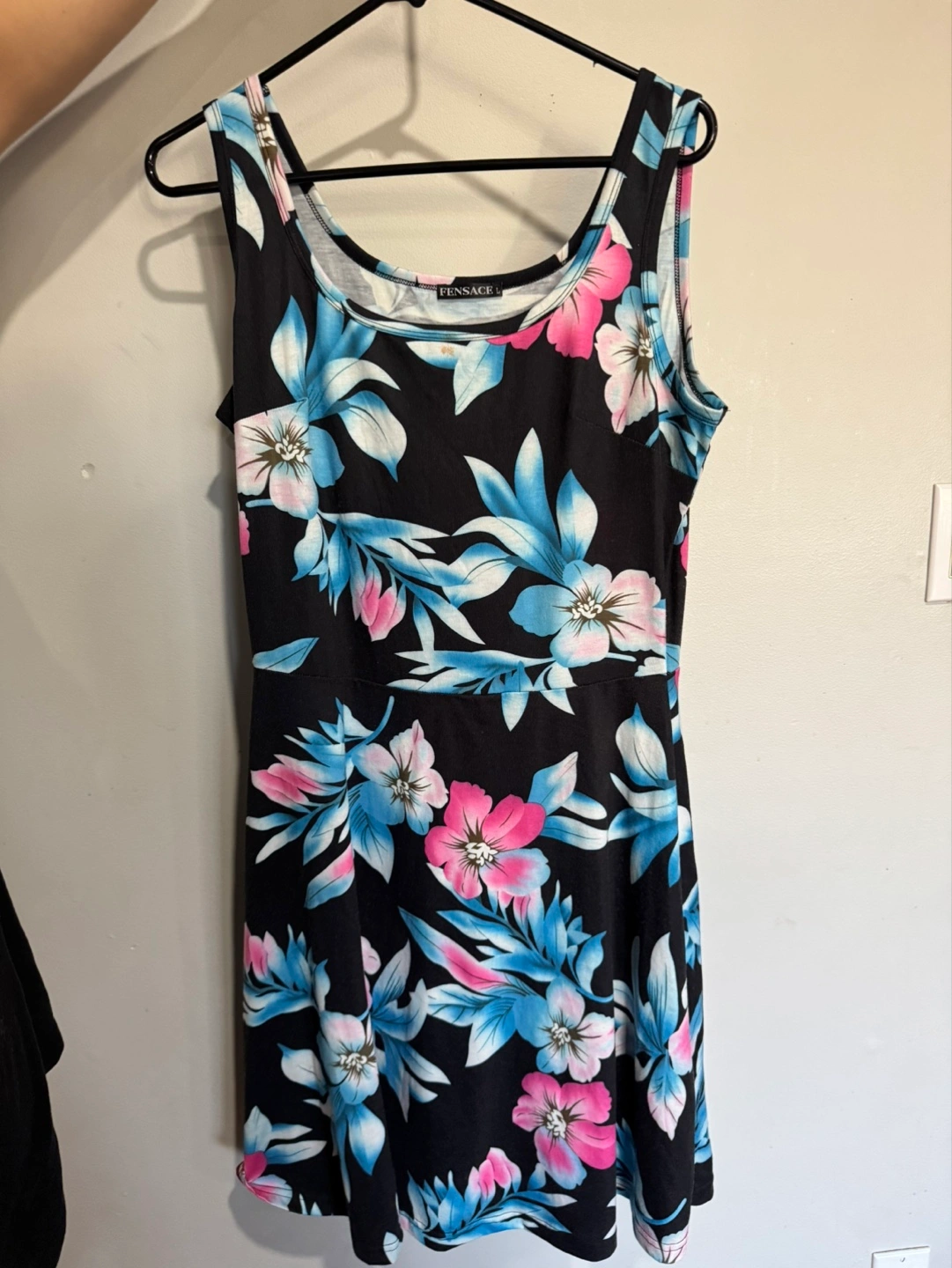 90Cute summer dress. Black background with pink and blue flowers. Size large. Sleeveless, scoop neck.