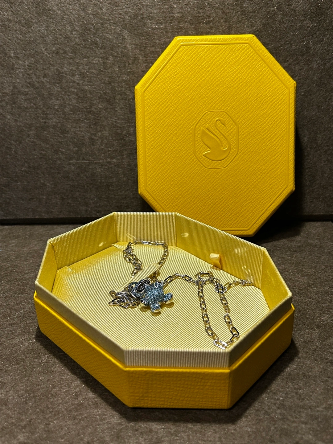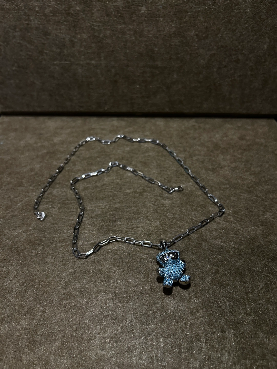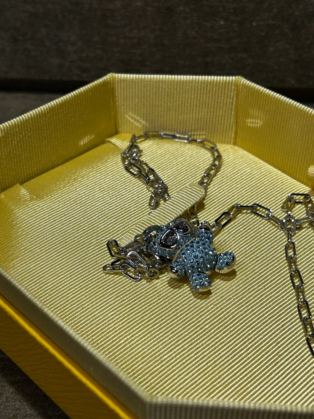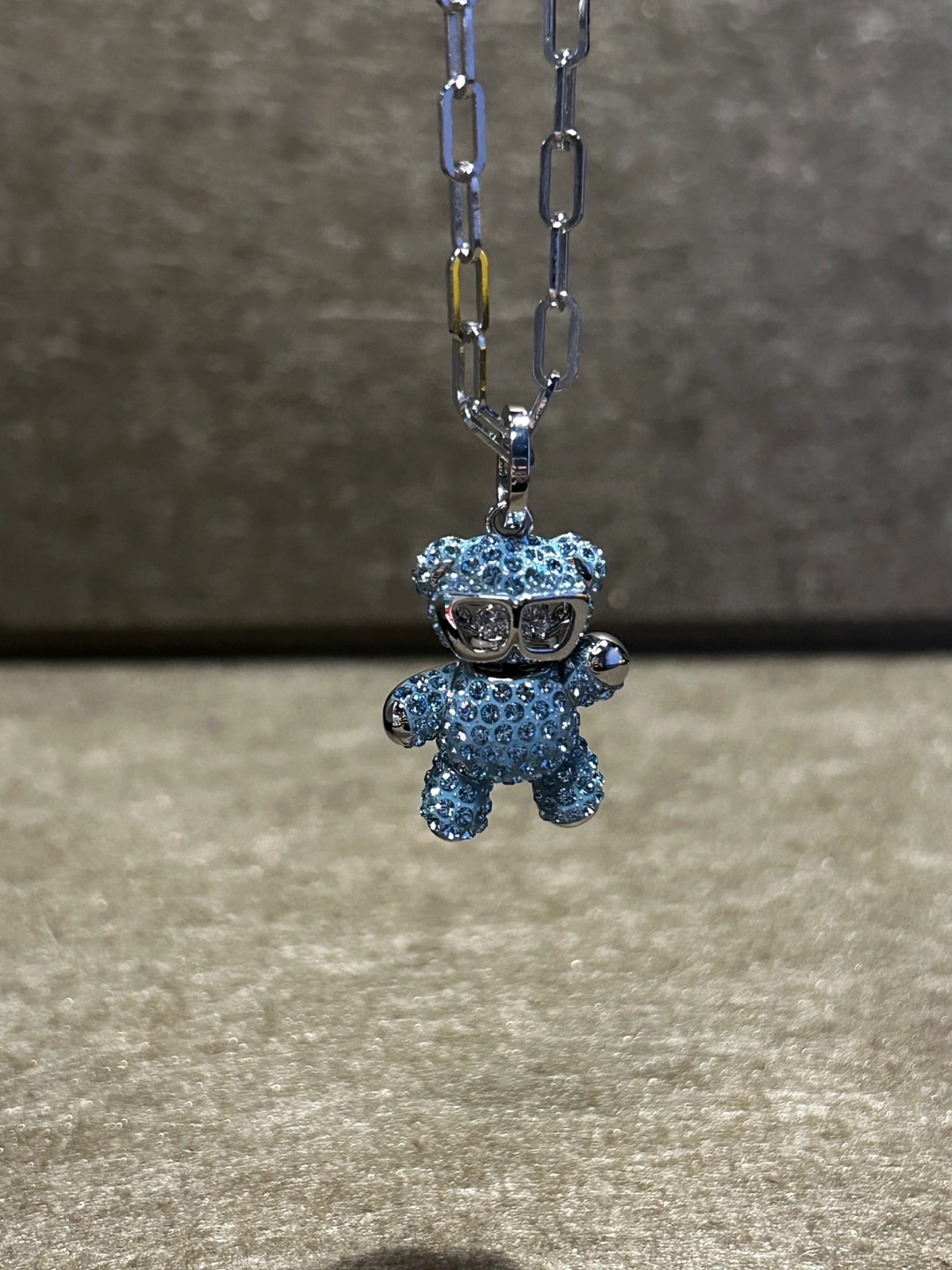 Swarovski teddy bear pendant necklace. Features light blue crystals. Silver-tone chain. Comes in original box.