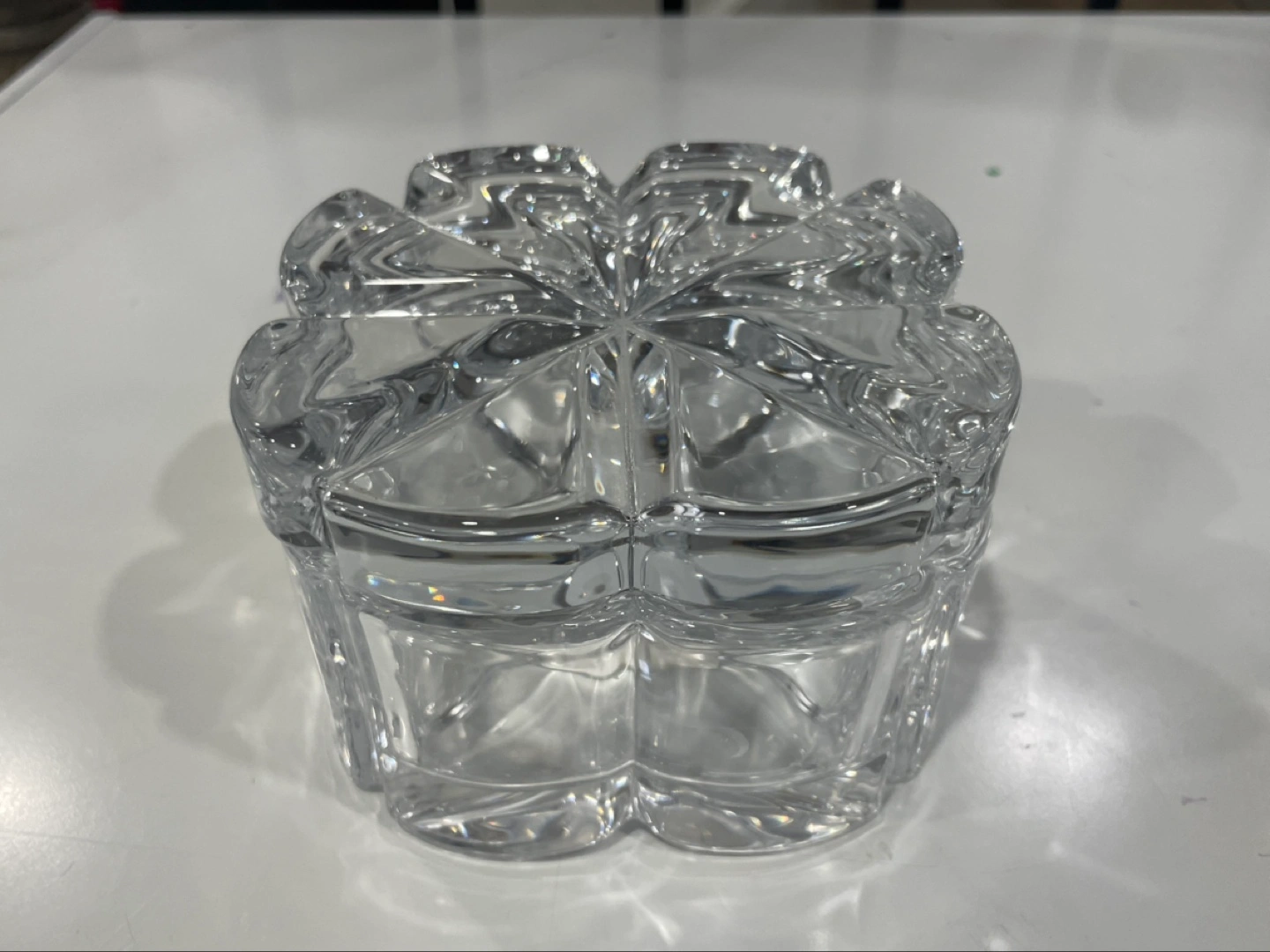 Buy & SellCrystal trinket boxCrystal trinket box$10Lovely clear crystal trinket box. Unique flower-shaped design. Perfect for storing small jewellery or other treasures. Includes lid.WHERE TO MEETMaple and James SnowView MapSELLERKatrinaMain181 review0 chats·0 favorites·13 views