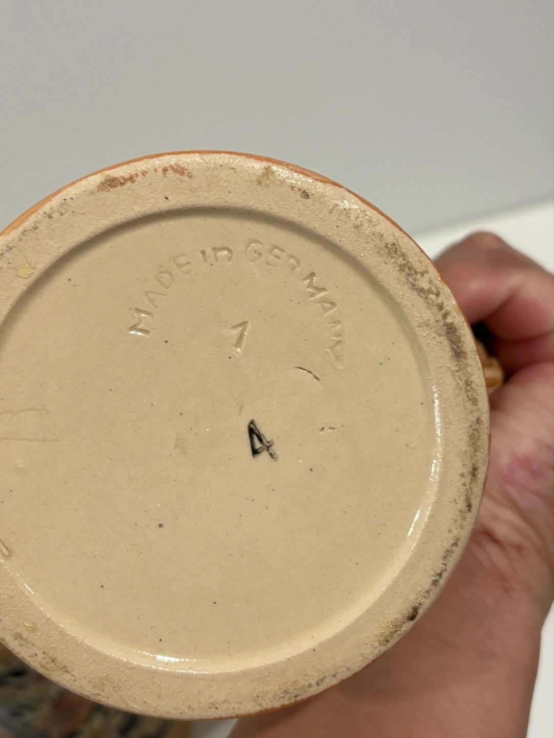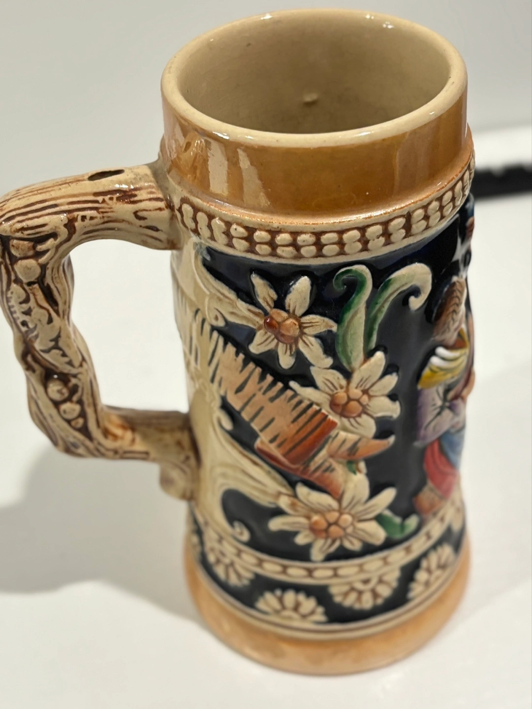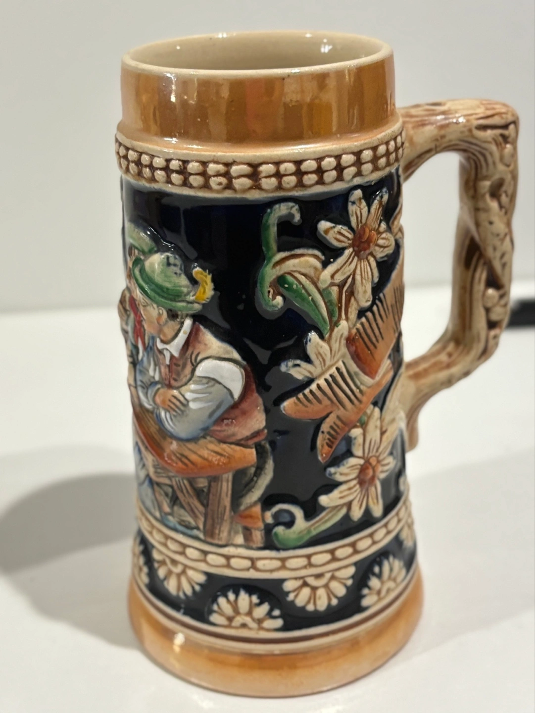 Small, collectible beer stein. Features colourful relief artwork of people drinking and playing music. Made in Germany. Intricate detailing.