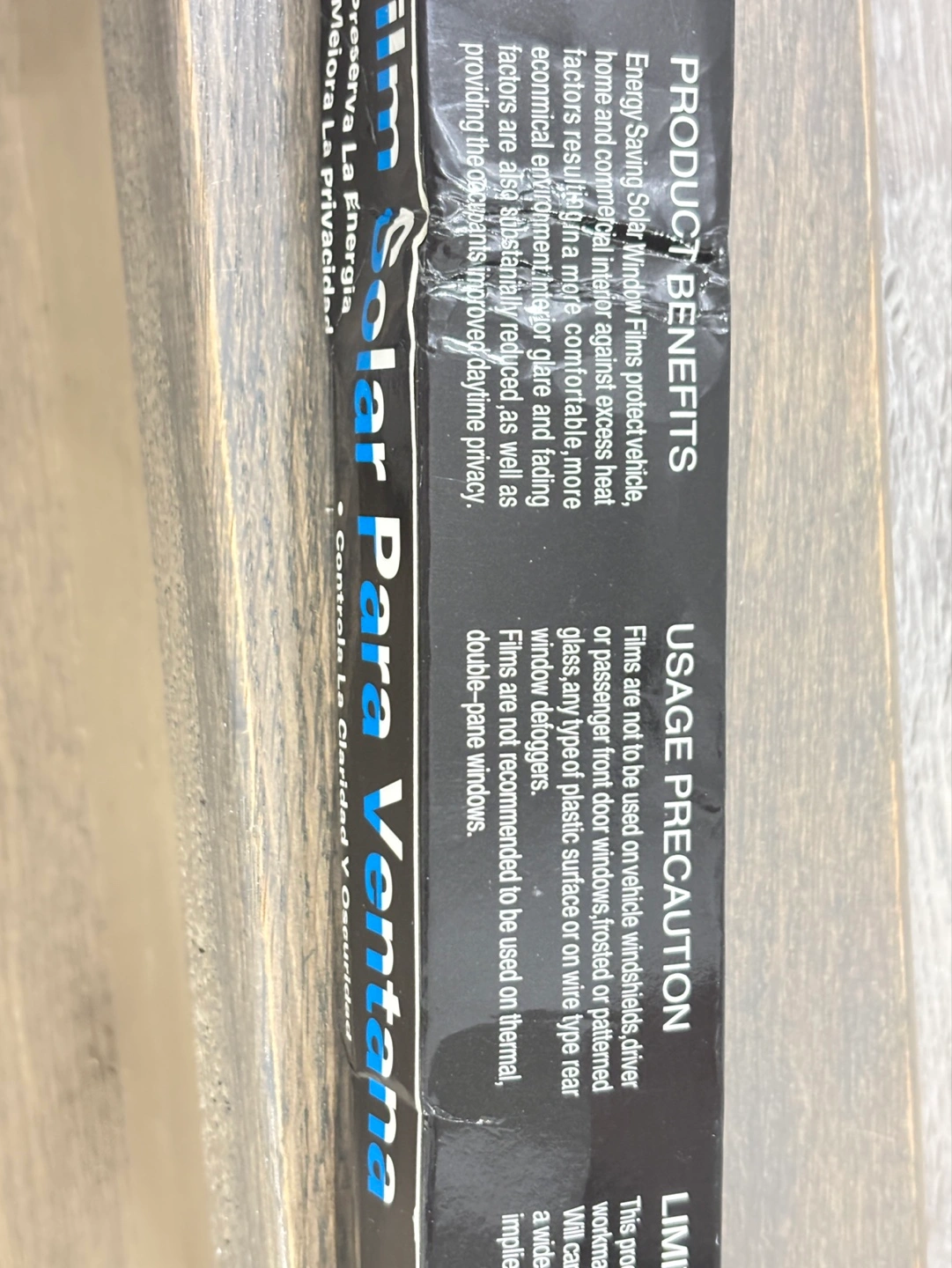 New solar window film. Reduces glare and improves privacy. Energy saving. Complete installation instructions included. Scratch resistant. UV block. Black glass.