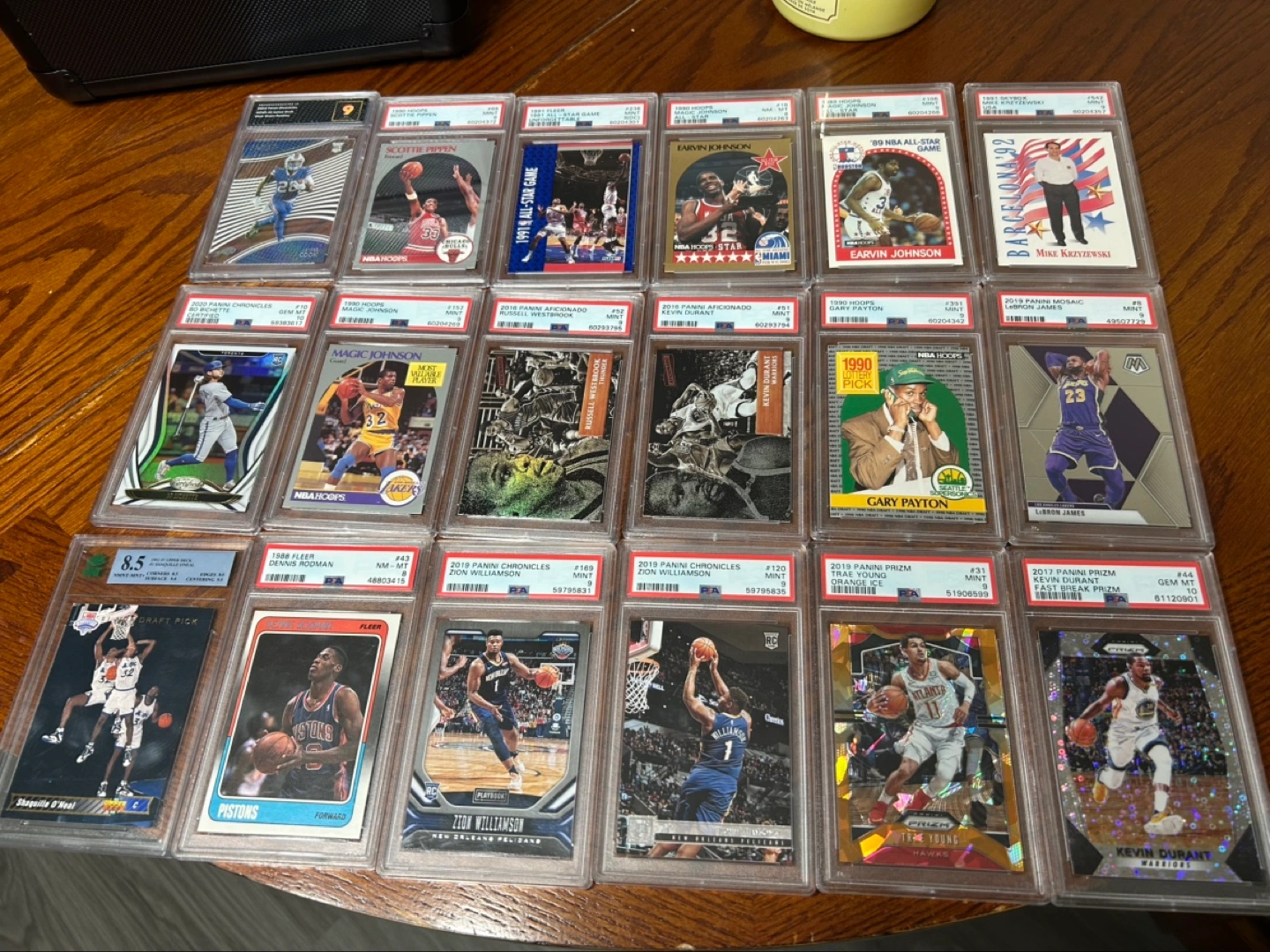 Various NBA trading cards, graded and in protective cases. Includes players like Scottie Pippen, Magic Johnson, LeBron James, and more. Different brands and years represented. Check images for details.