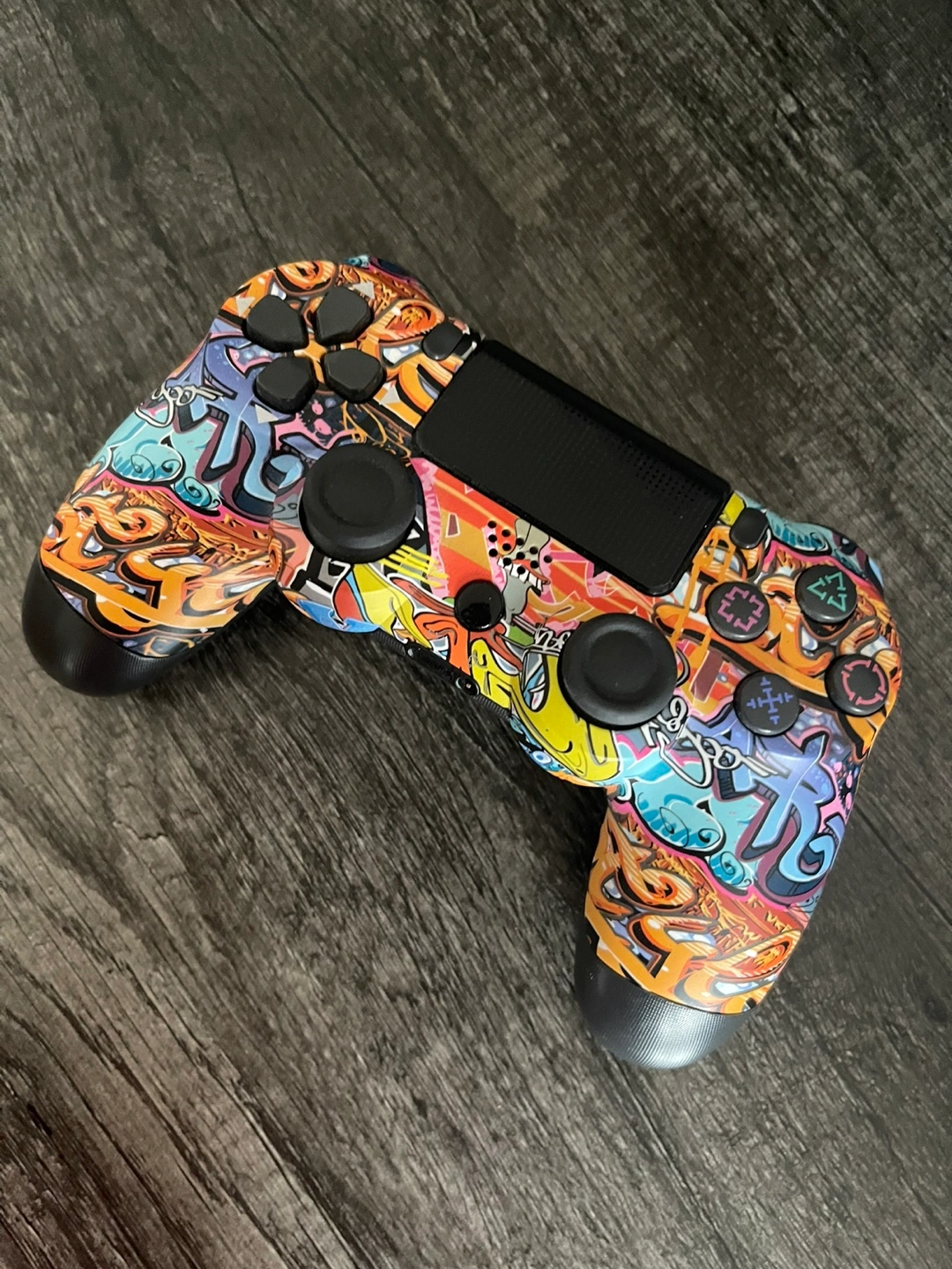 Wireless PlayStation 4 controller. Features a colourful graffiti design. Includes all standard buttons and joysticks. Great for gaming.