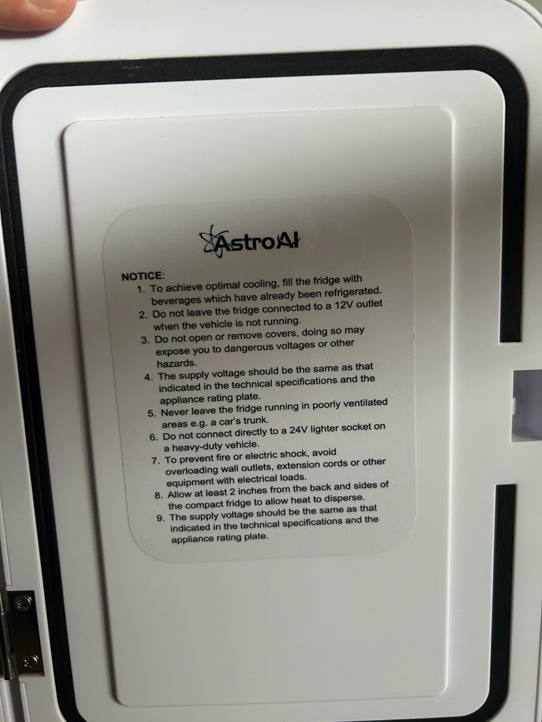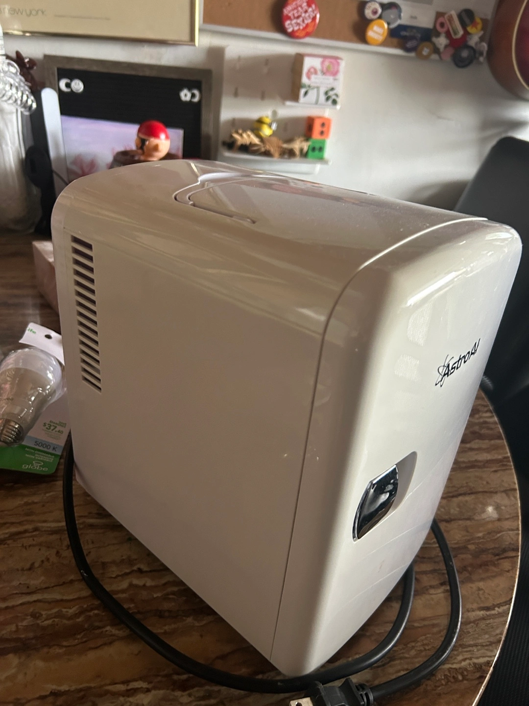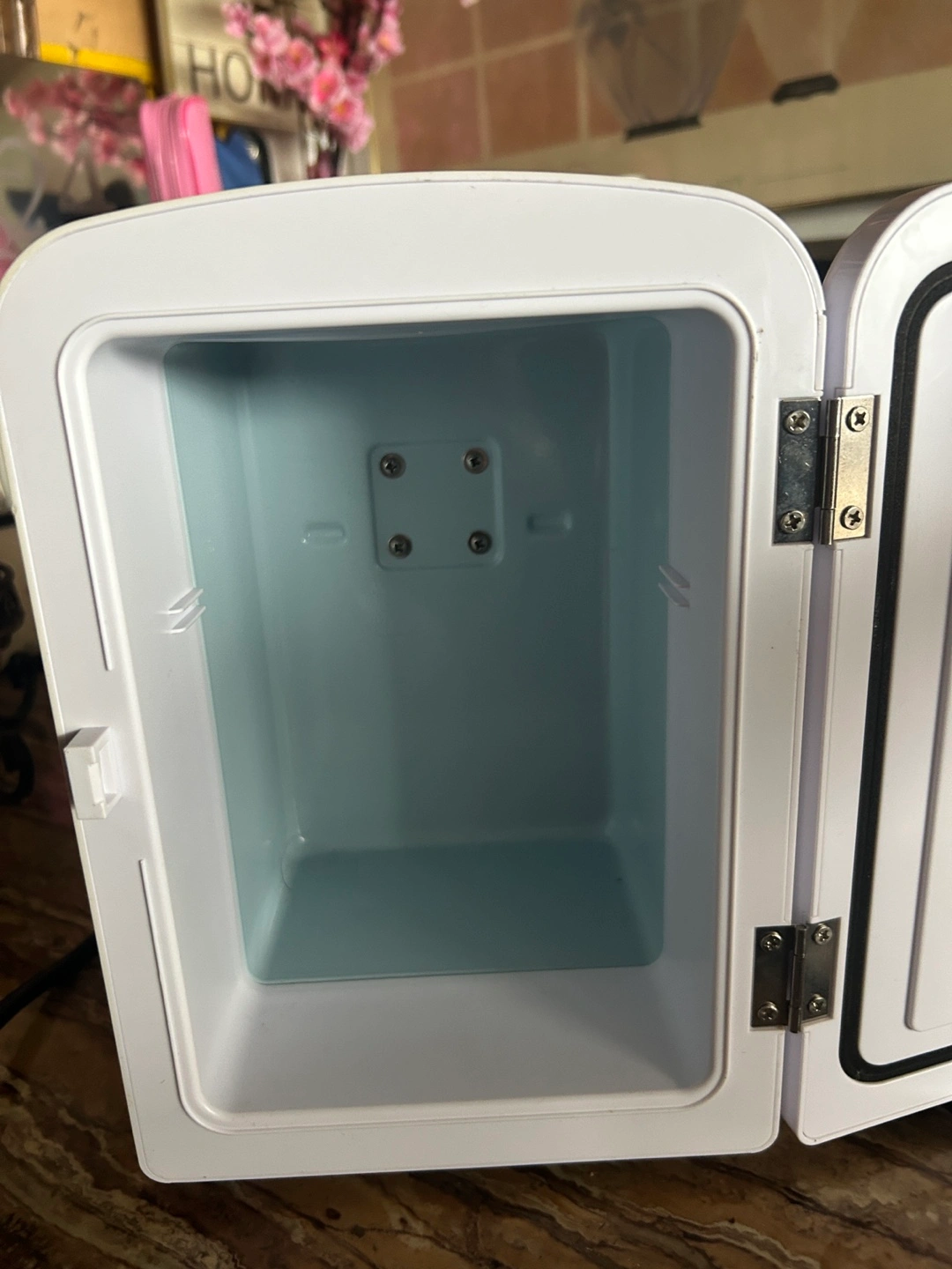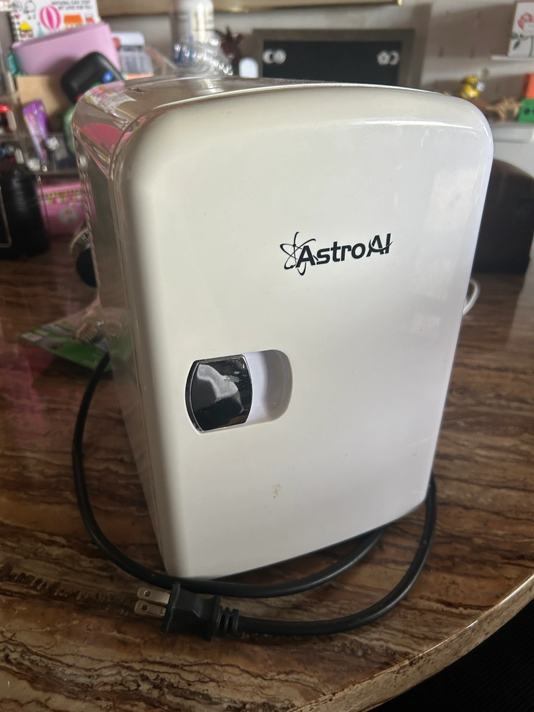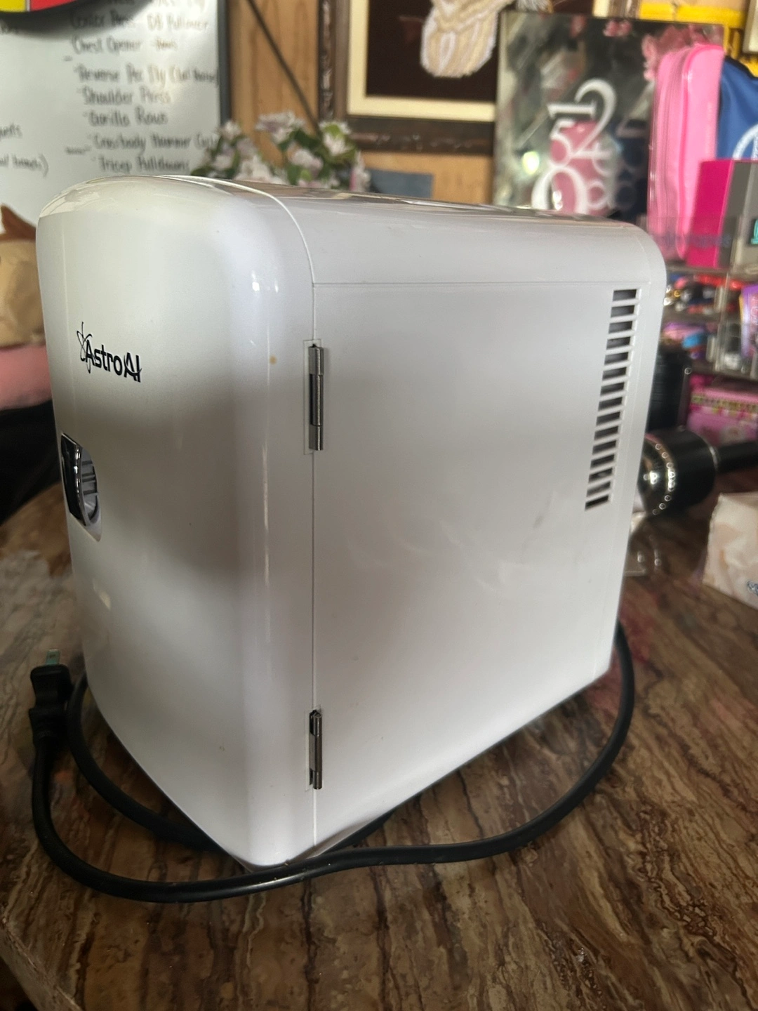 196Portable mini fridge. Great for drinks or small items. White in colour. Includes power cord.