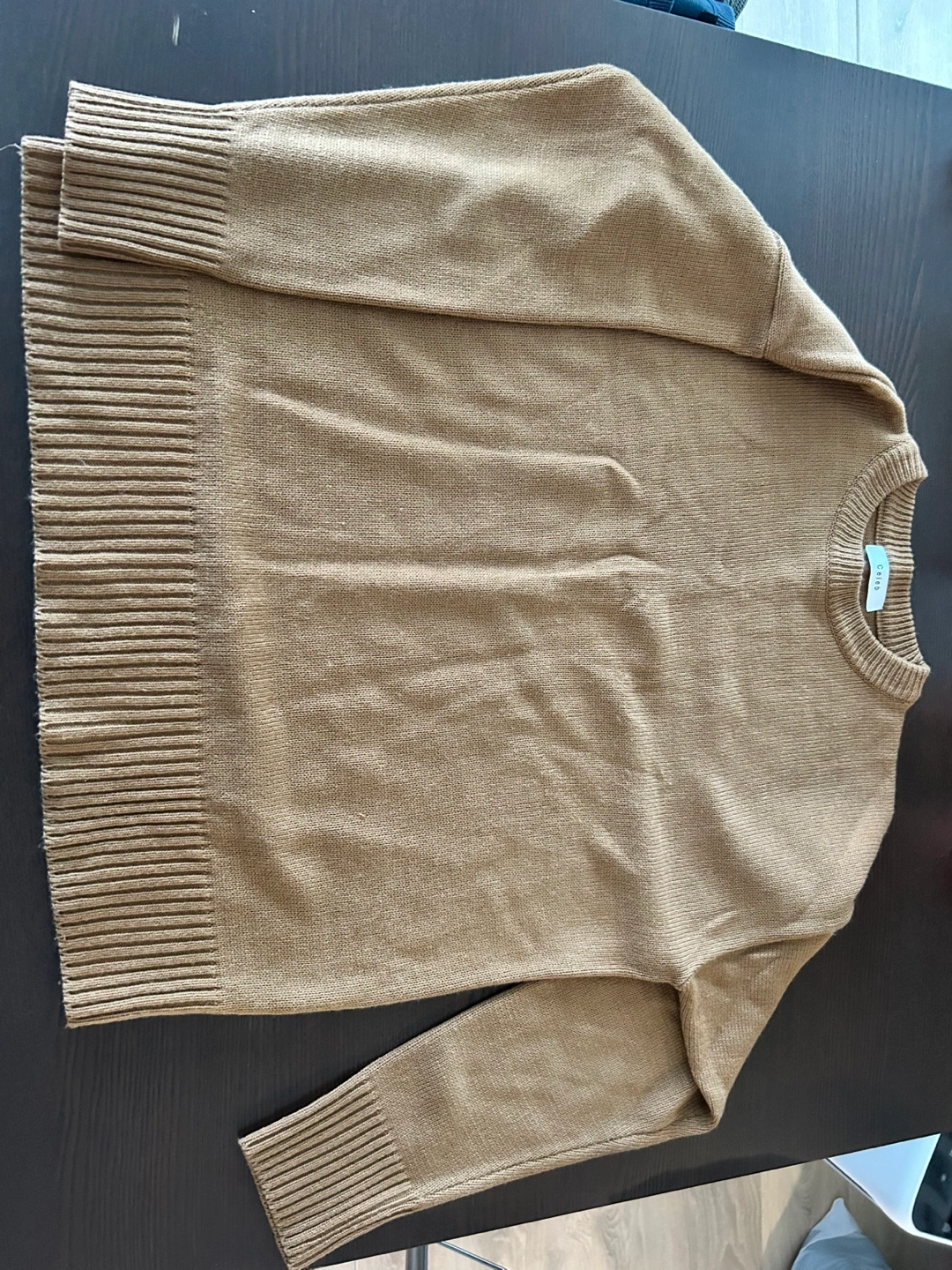 Cozy and warm crewneck sweater in colour camel. Ribbed cuffs and neckline. Fits men M-L.