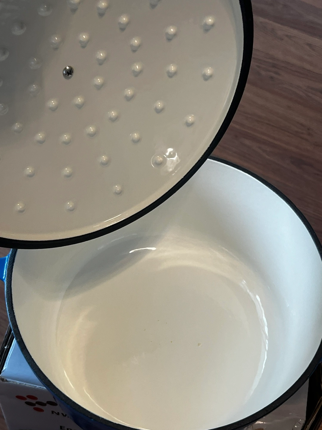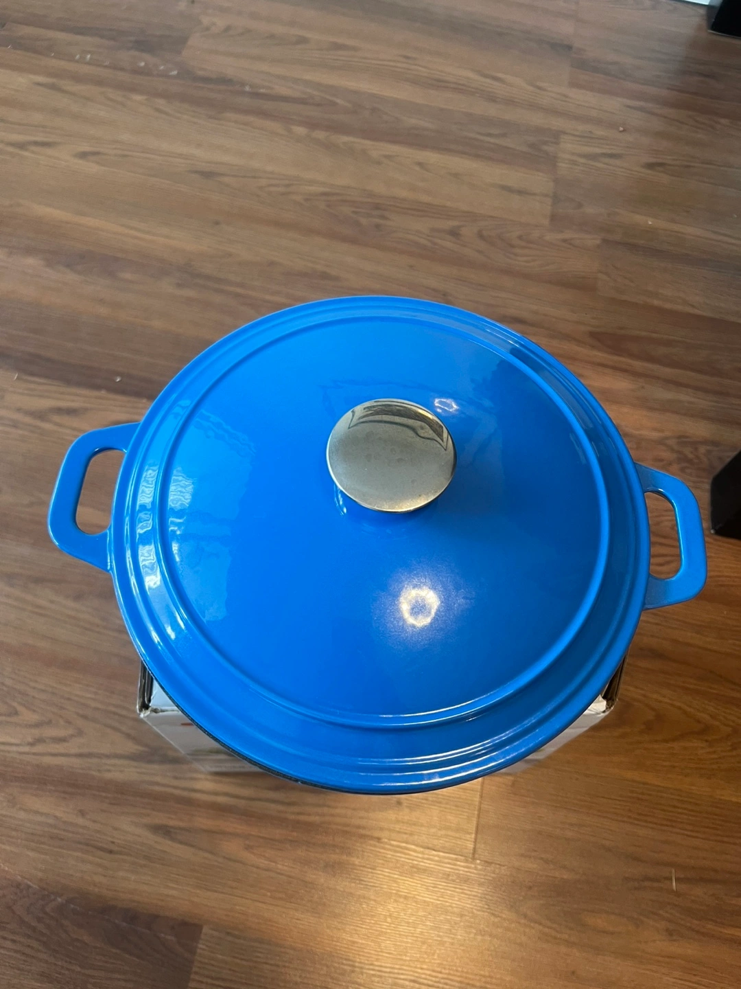 1000+Never used. Brand new in box Enamel cast iron Dutch oven. 5.1 quart capacity. Blue exterior, off-white interior. Features two handles and a lid with a knob. Ideal for stews, baking, roasting, etc **Please be aware that is quite a heavy Dutch pot as they typically are** Home Houseware Large pot Dutch pot Cast iron Dutch pot Blue pot