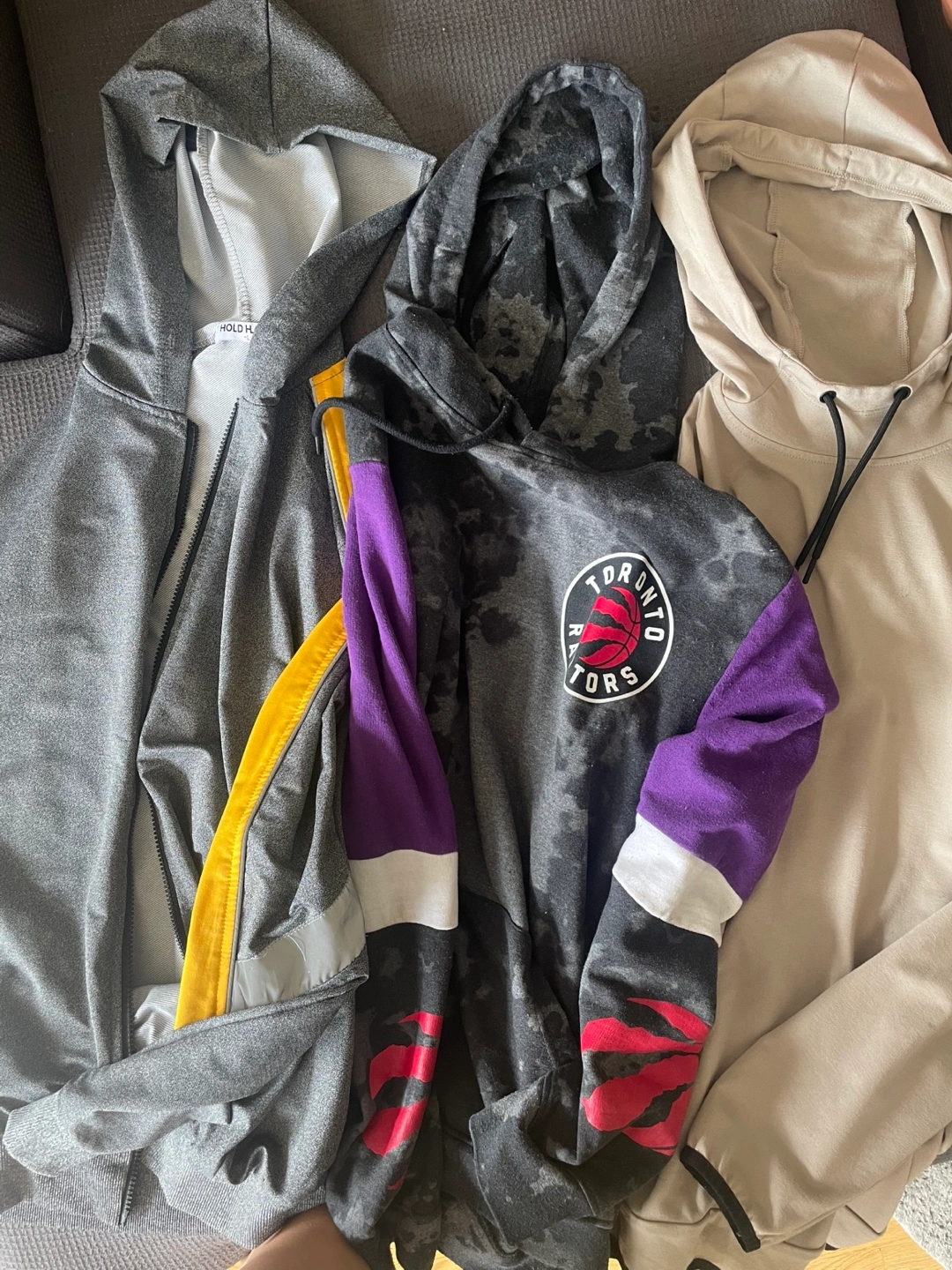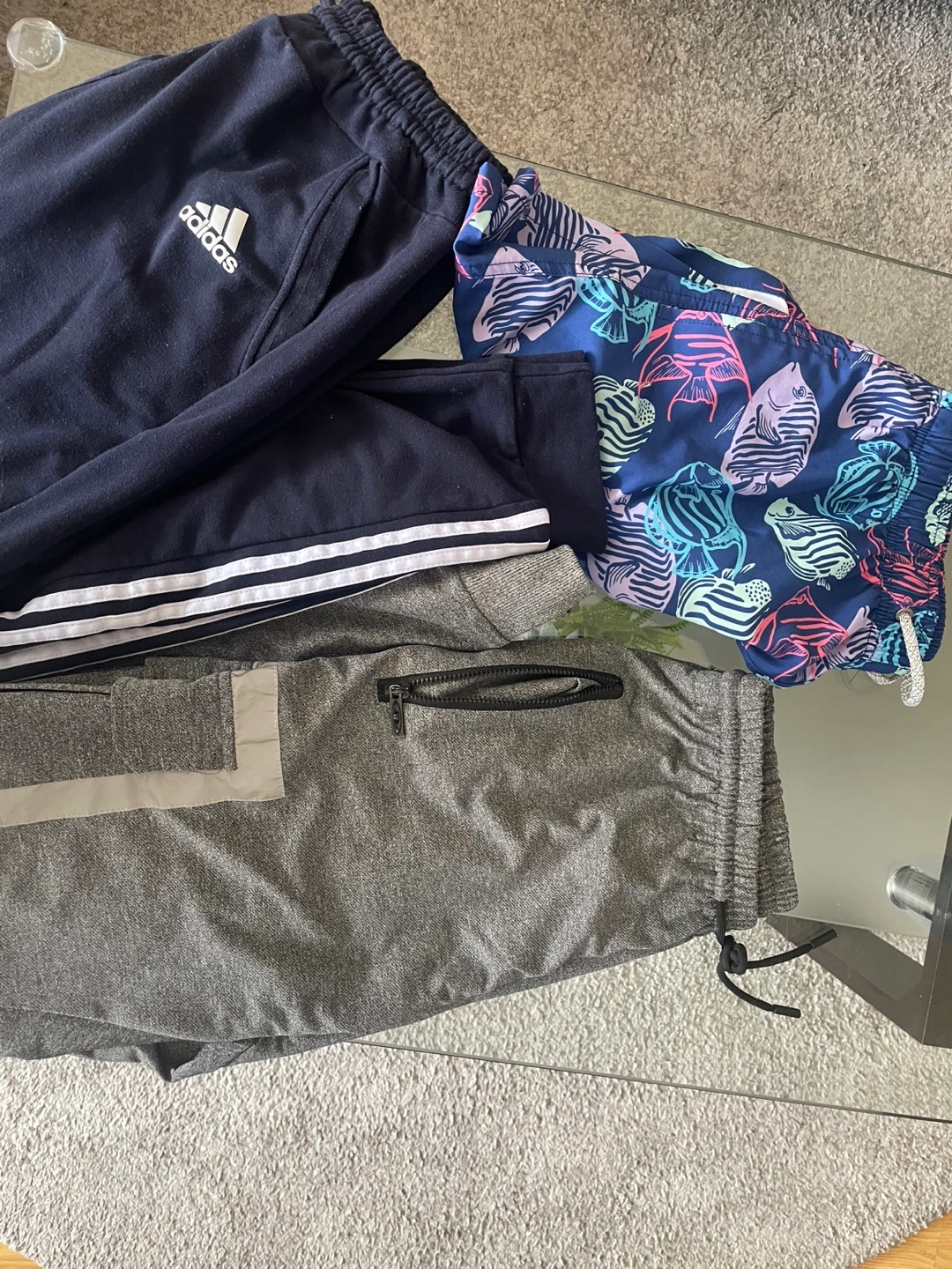 Bundle includes three pairs of boys' pants, three hoodies, and one pair of running shoes. Adidas joggers, grey sweatpants with reflective detailing, and swim trunks. Hoodies and solid colours. All $25