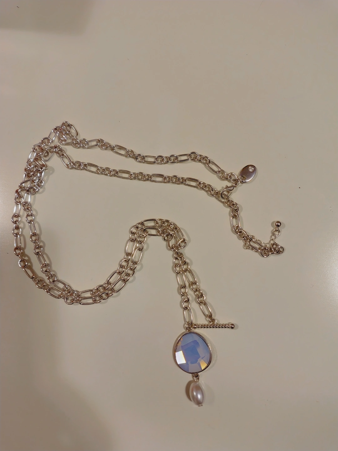 Silver Tone Chain Necklace with Faceted Oval Pendant and Pearl
