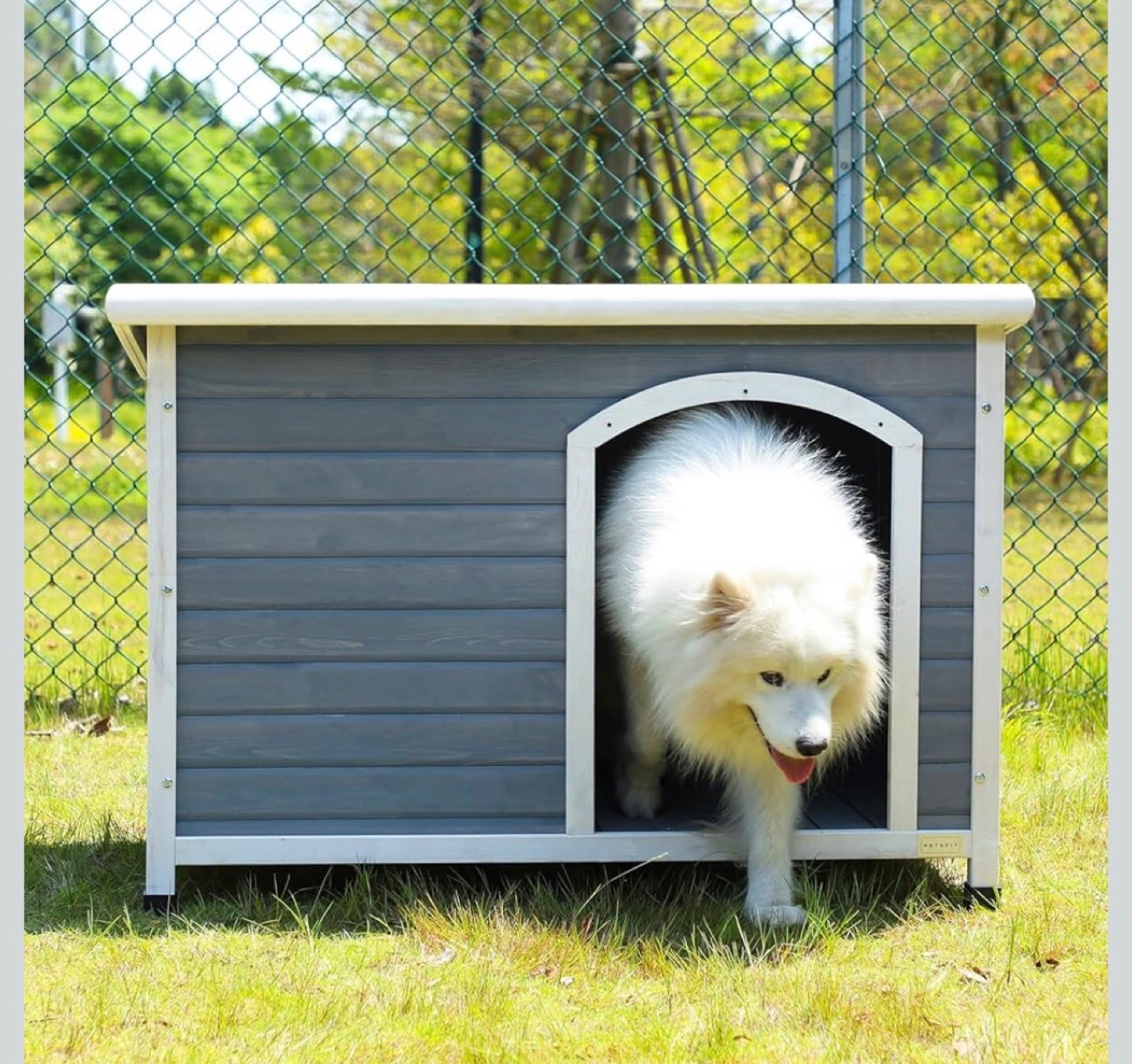 Medium outdoor/indoor dog house. Light Grey and white design. Features removable floor and top opening for easy cleaning. Durable and weatherproof construction. Great for medium dogs
