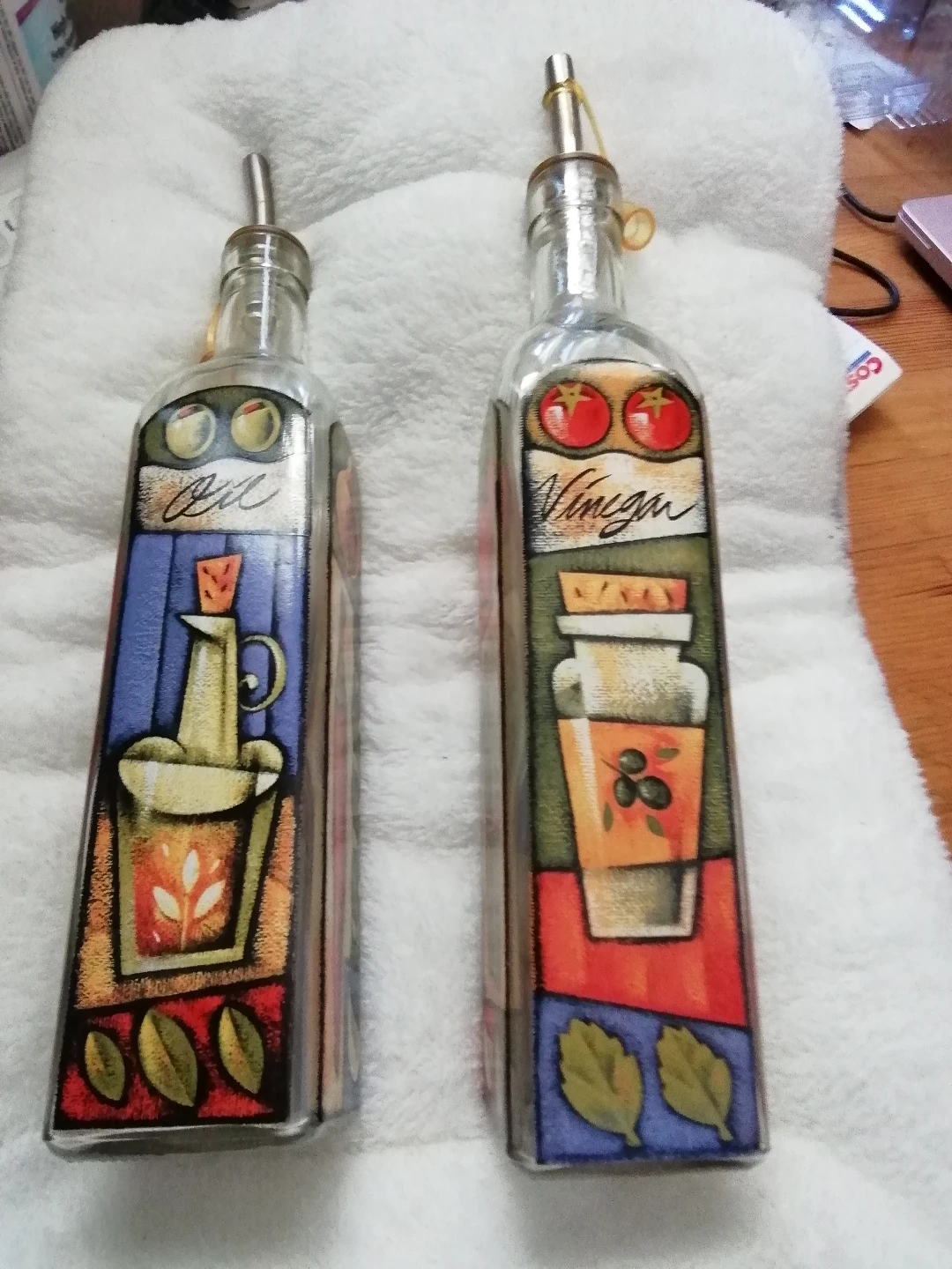 two lovely glass bottles, one for oil and one for vinegar. Each bottle features a colourful design. Includes pour spouts. Perfect for the kitchen.