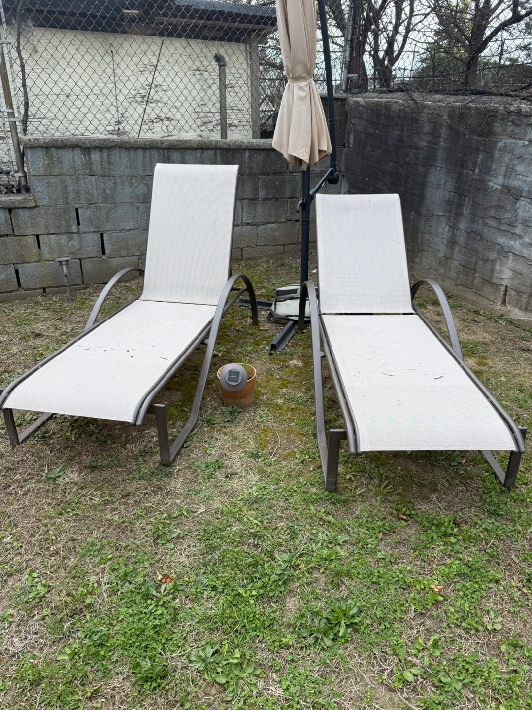 Two outdoor chaise lounges. Metal frames. Beige sling fabric. Good for relaxing by the pool or in the backyard. Bought at Fortunoff. Comes with chair cover, also bought at Fortunoff.