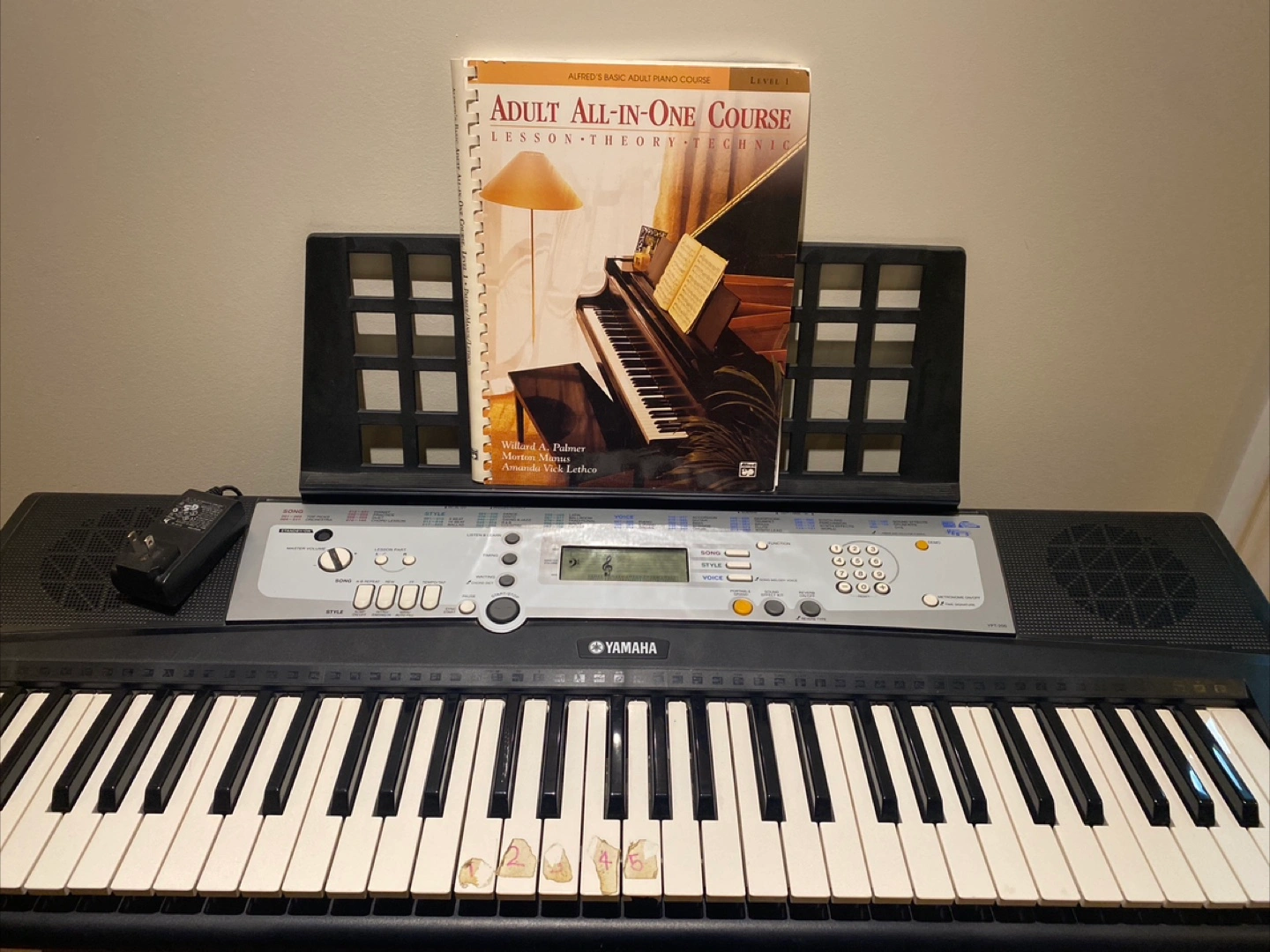 110Yamaha keyboard with 61 keys. Includes power adapter and music stand. Adult All-in-One Course lesson book included. Good condition.