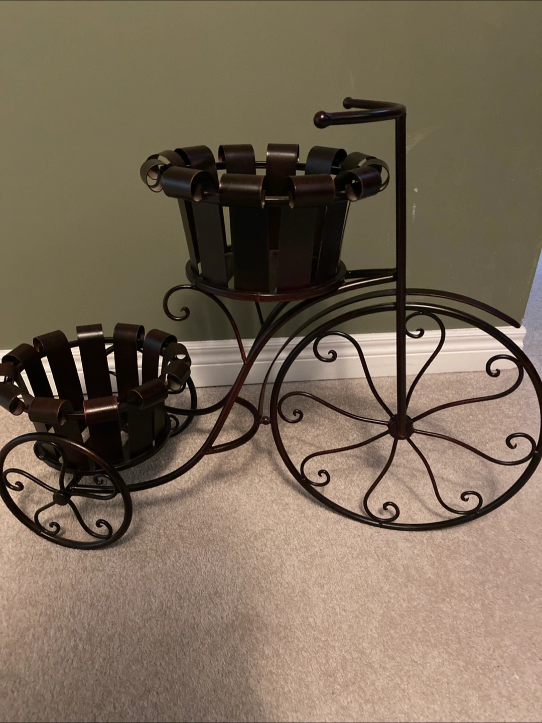 Buy & SellMetal Tricycle Planter StandMetal Tricycle Planter Stand$20Ornate metal tricycle planter. Features two baskets. Dark brown finish. Decorative accent for home or garden.Dimensions30 L x 24 H x 12 W inches2 chats·3 favorites·45 viewsSELLERverifiedZitaThe Hill1204 reviewsWHERE TO MEETCheck Location