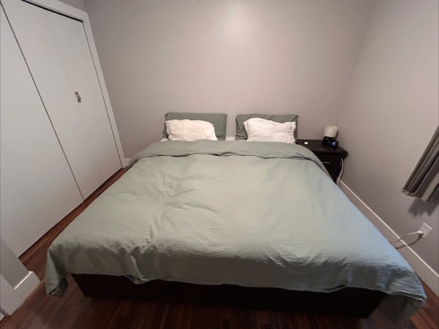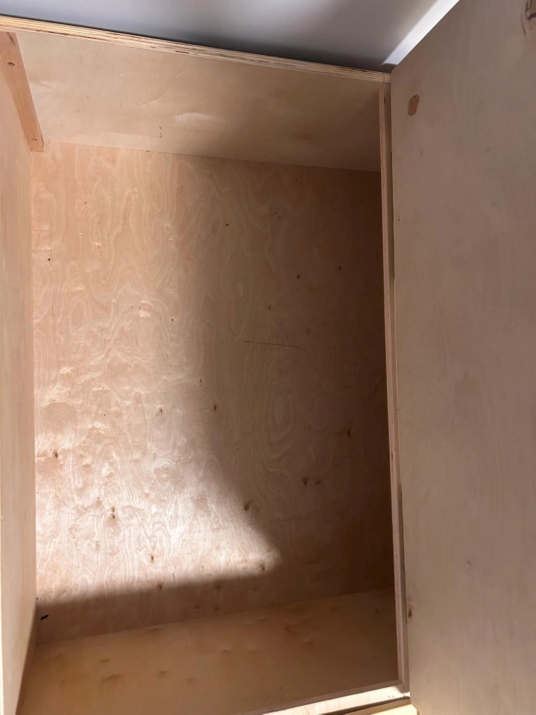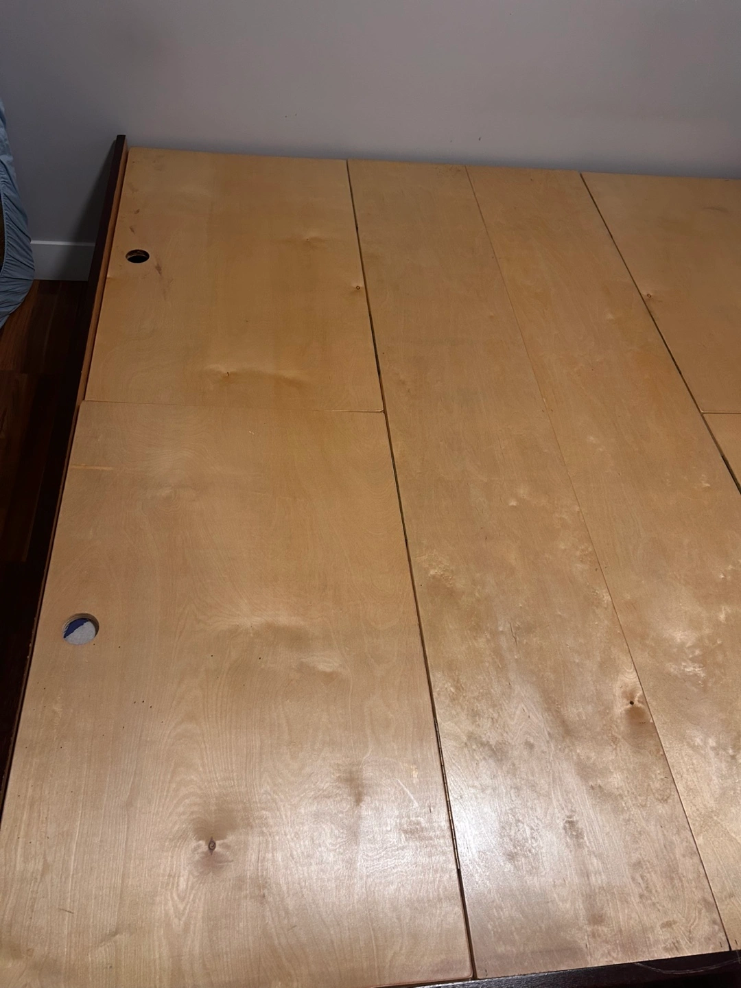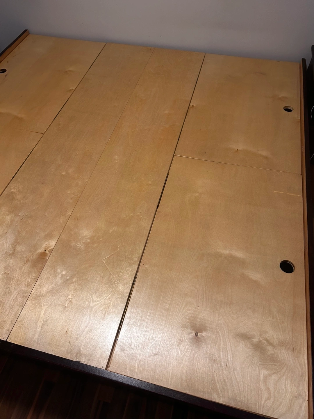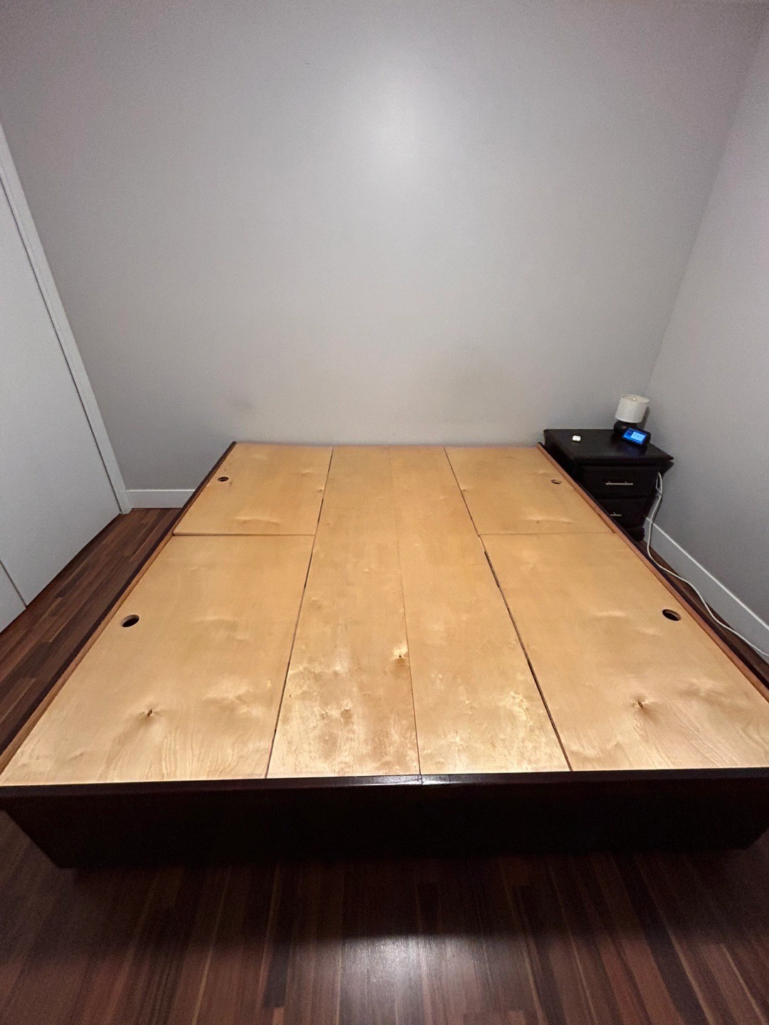 King-size platform bed frame. Four lift-up panels for storage. Dark brown frame. Birch plywood top. Minimal assembly required.