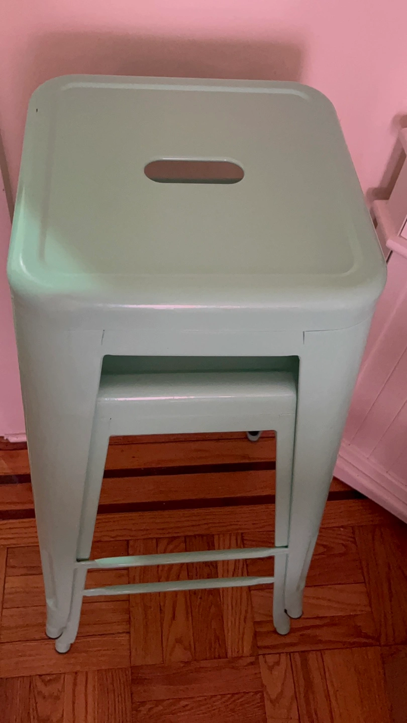 Two mint green metal stools (30”) Stackable design. Simple, clean lines. Perfect for kitchen counter or bar. $50 for both.