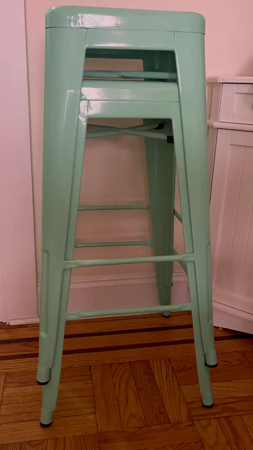 Two mint green metal stools (30”) Stackable design. Simple, clean lines. Perfect for kitchen counter or bar. $50 for both.