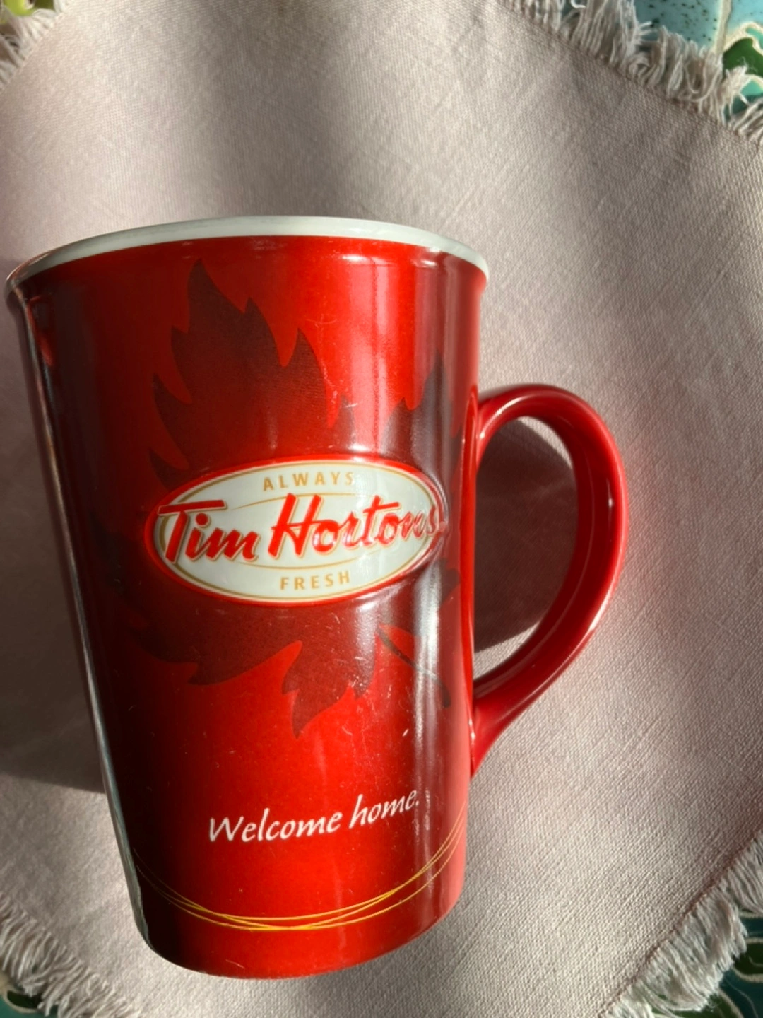 Red Tim Hortons mug. Features a maple leaf design. Limited edition, number 011. Made in China. Welcome home message.