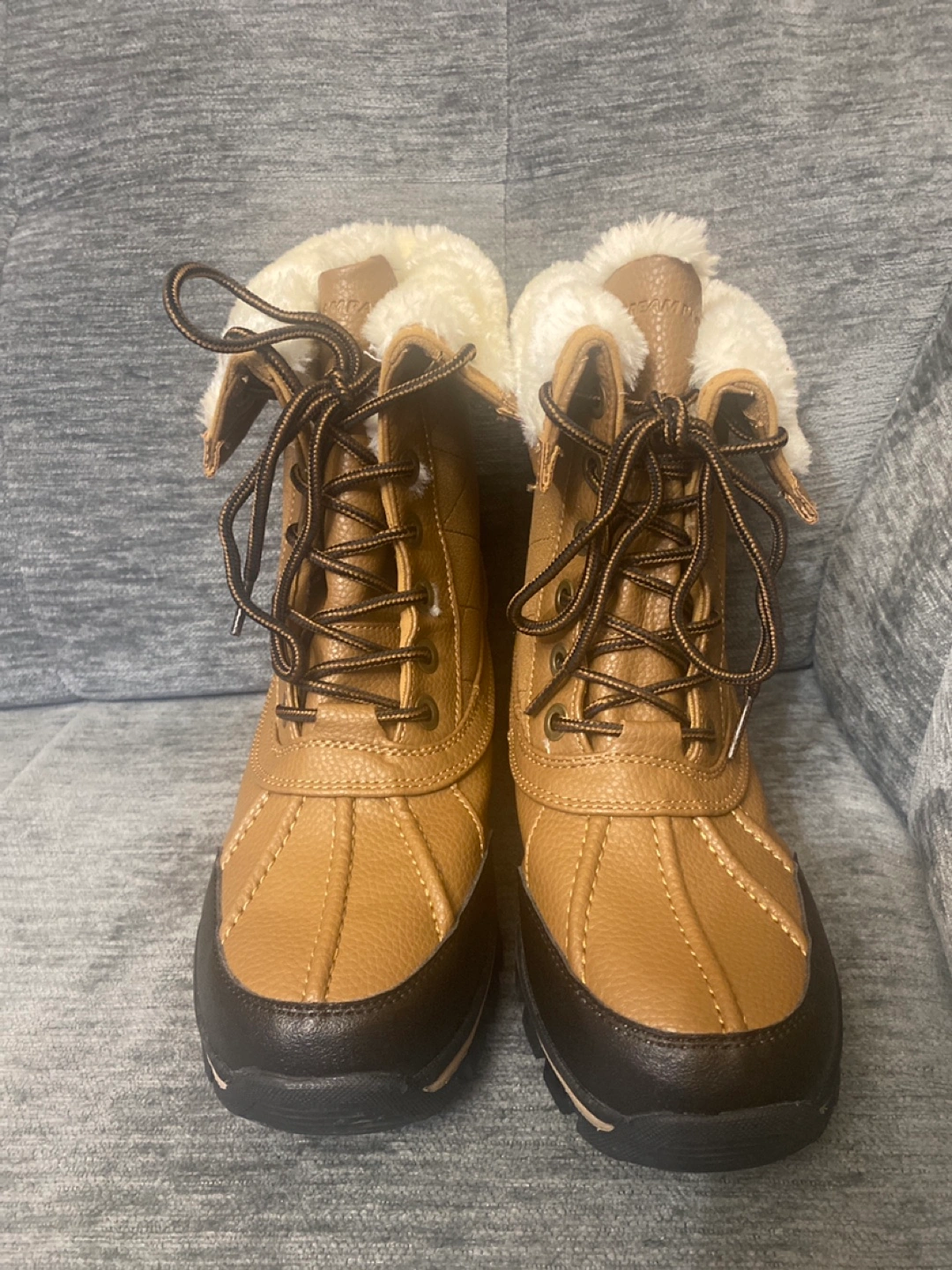 Warm winter boots. Brown faux leather upper. Faux fur trim. Lace-up closure. Water-resistant. Thinsulate insulation. Size US 8. Pick up location Royal and Mimico