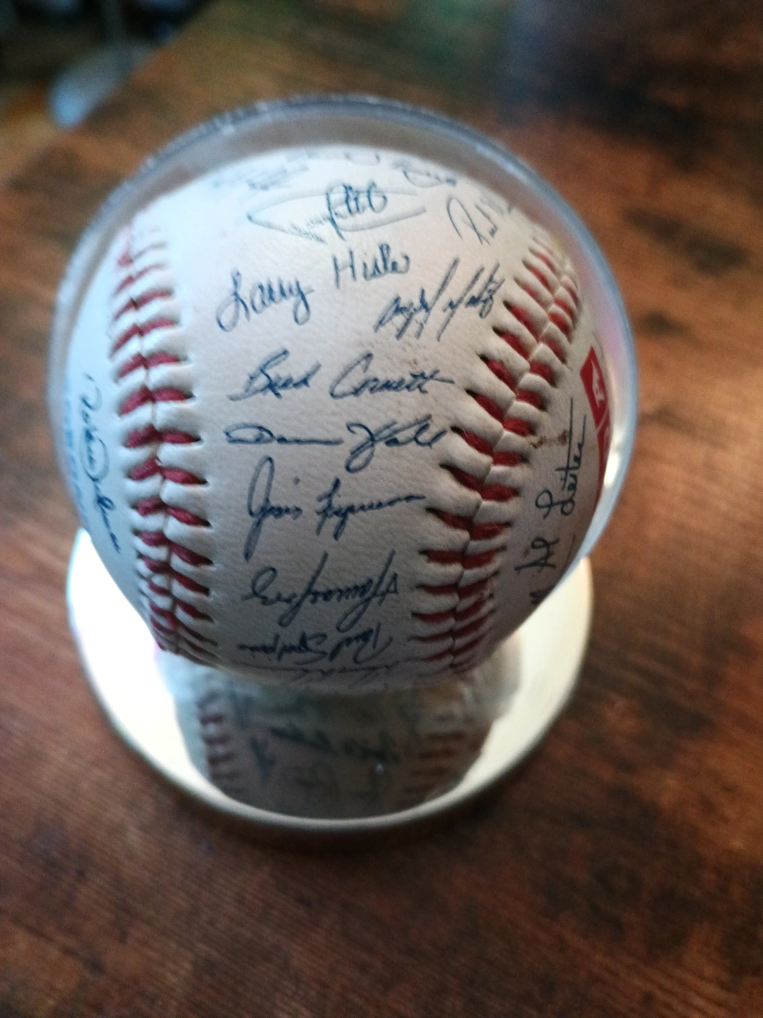 Collectible baseball featuring numerous autographs. Preserved in a clear plastic display case. Perfect for collectors or memorabilia enthusiasts.