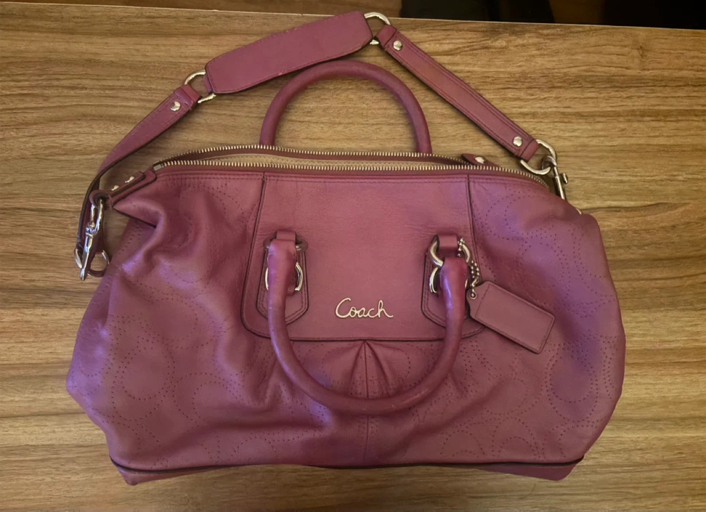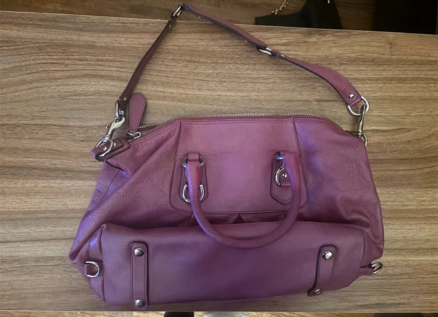 This is a lovely plum-coloured Coach leather handbag. It features the signature Coach logo embossed all over the leather. It has a top zip closure and comes with both top handles and a detachable shoulder strap.
