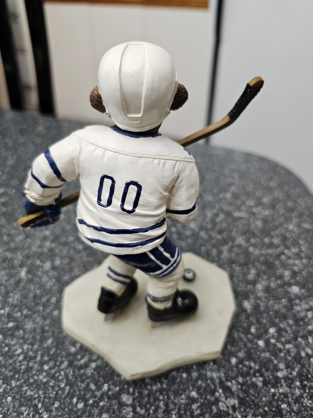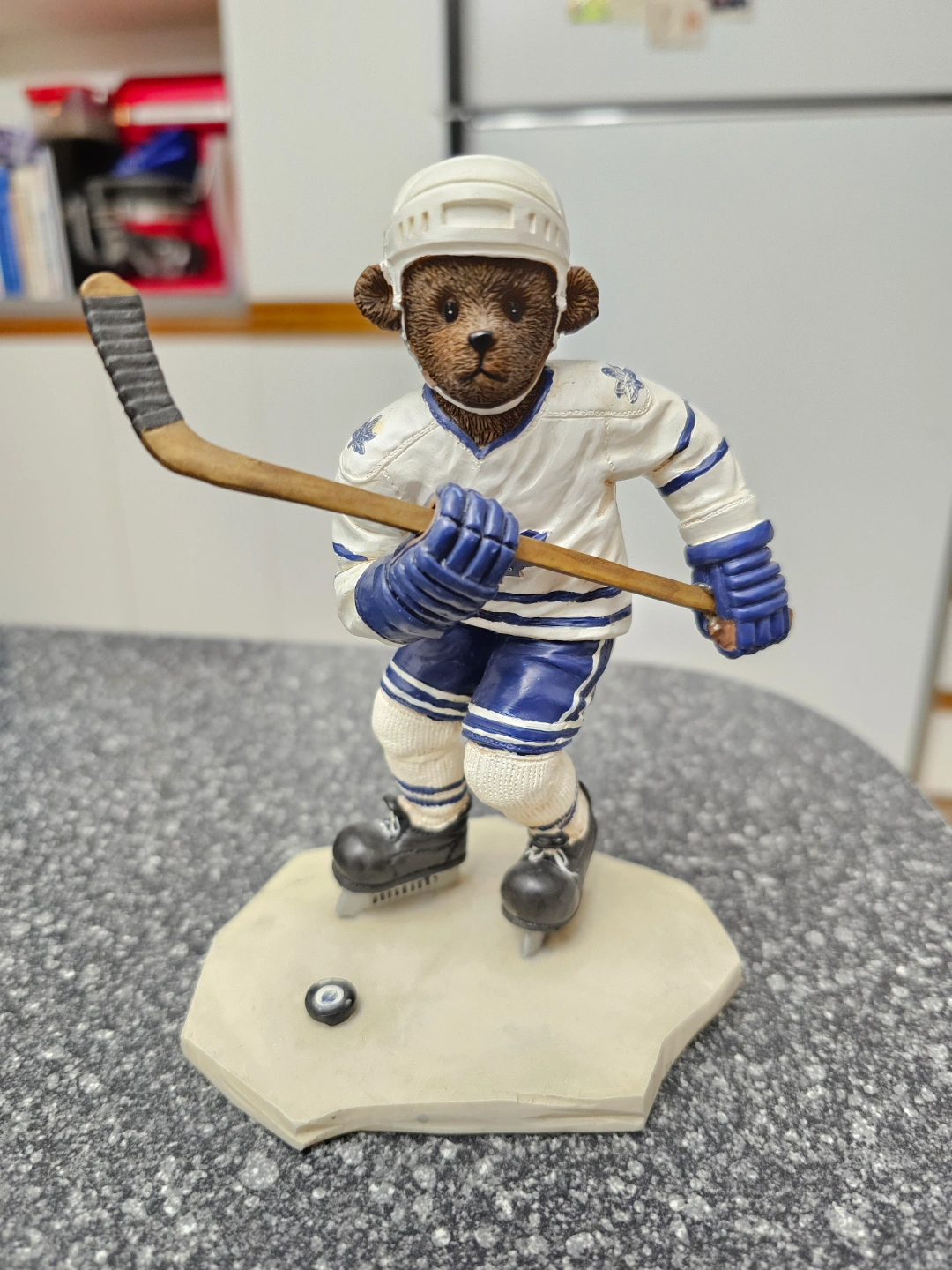 Collectible figurine. Features a teddy bear in a Toronto Maple Leafs hockey uniform. Number 00 on the back. Comes with a base and puck. NHL licensed.