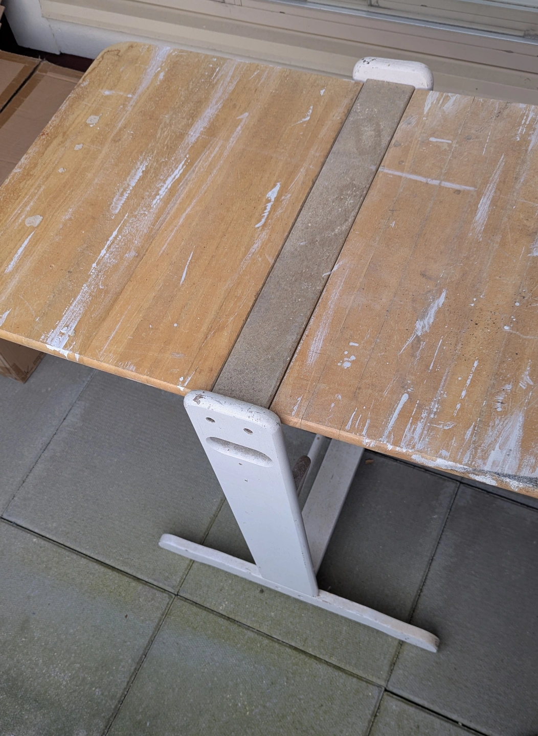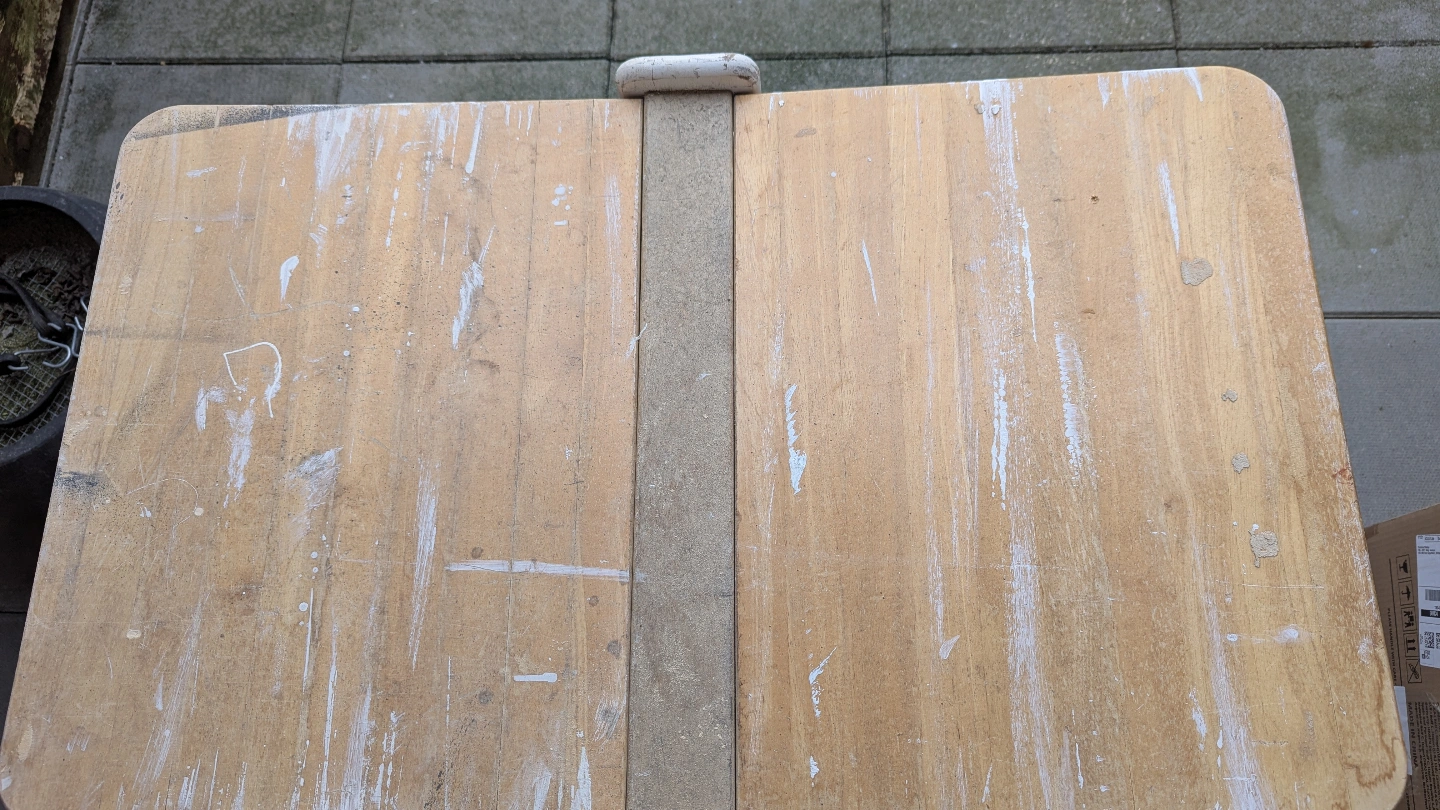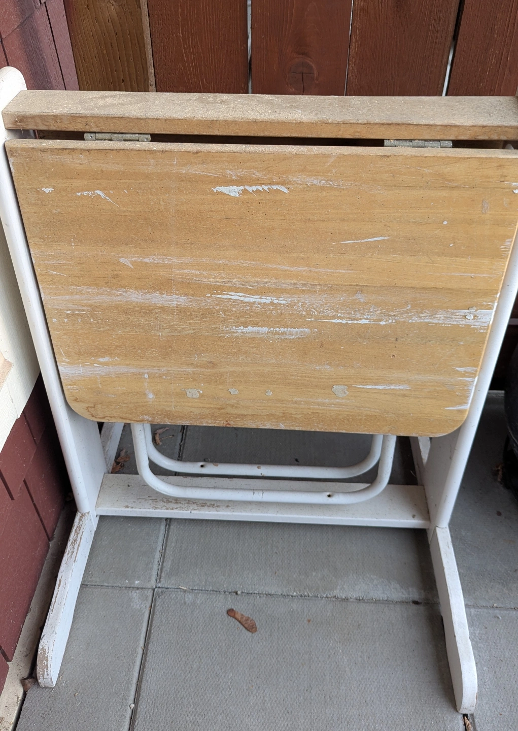 Foldable table, white legs, light wood top. Shows wear and tear. Great for a project or restoration. Could be used as a craft table or small desk.