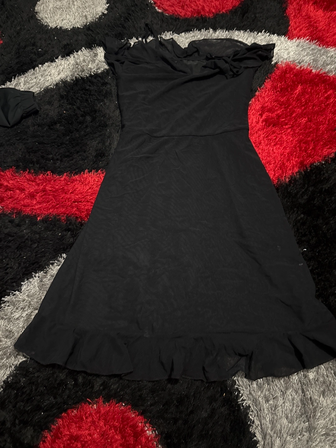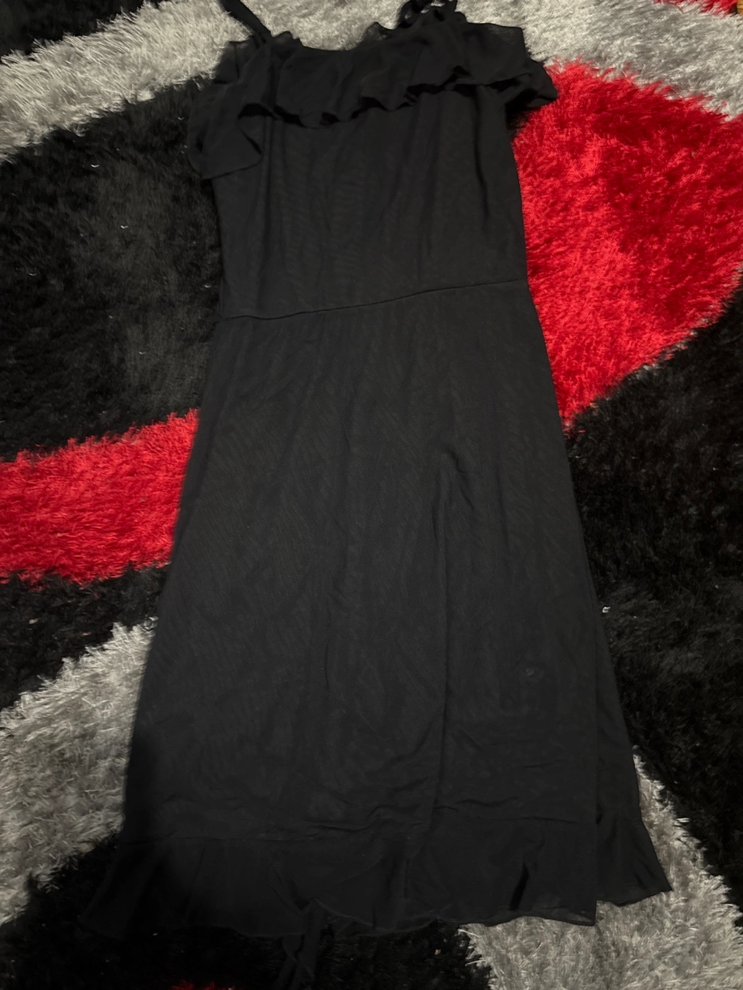 Elegant black sheer midi dress. Features ruffles at the shoulders and hem. Lightweight and flowy fabric. Perfect for a summer event.