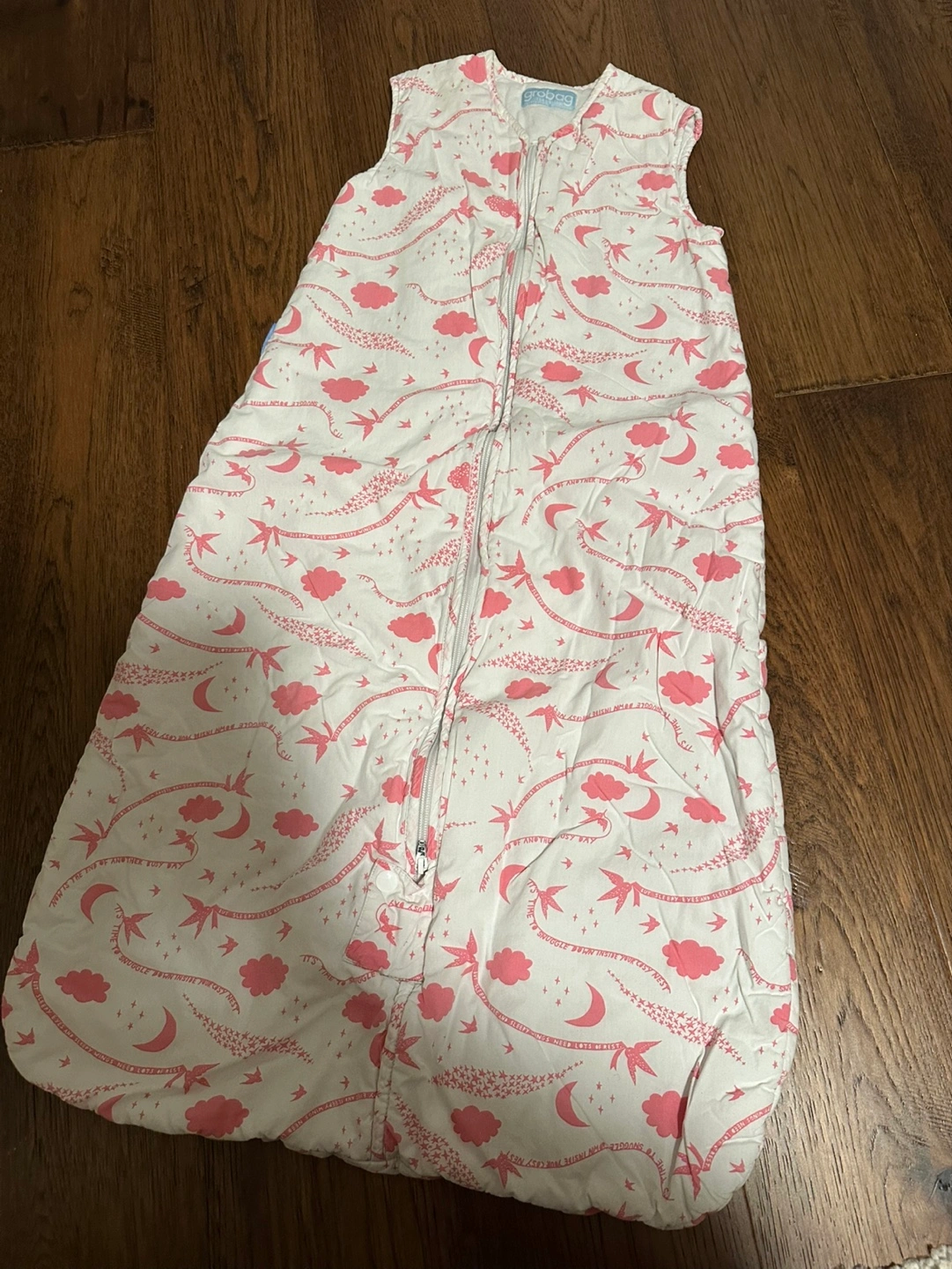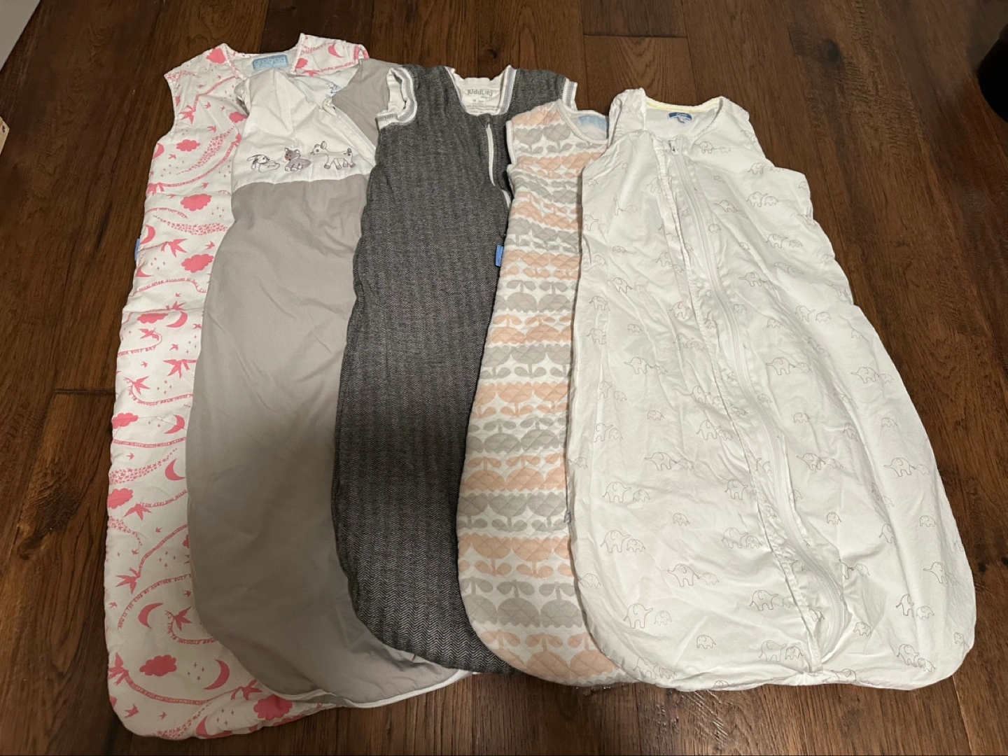 131A variety of sleep sacks in different sizes and weights, for cozy and safe sleep. White elephants - Brand: Jacadi Paris - Weight: Light, 0.5 TOG - Size: 6-24 months (adjustable length) Grey/Pink tulips - Brand: Grobag - Weight: Medium, 1.5 TOG - Size: 6-18 months Dark Grey - Brand: Juddlies - Weight: Medium, 2 TOG - Size 18-36 months Grey/White colour blocks - Brand: Sterntaler Germany - Weight: Winter, 2.5 TOG - Size: 90cm Pink clouds and birds - Brand: Grobag - Weight: Winter, 2.5 TOG - Size: 18-36 months $15 each $60 for all