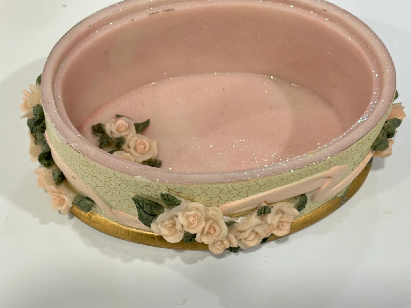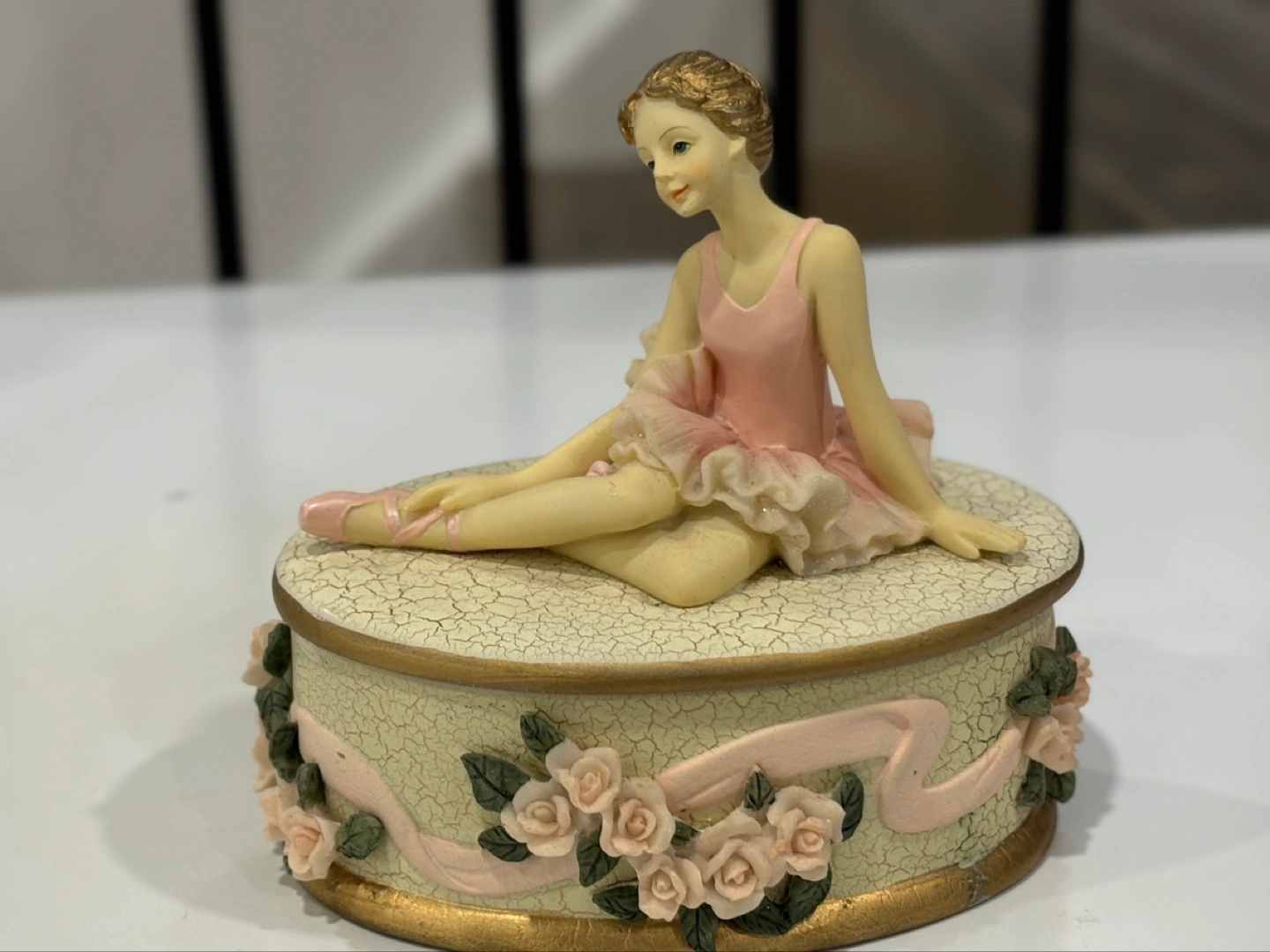 Oval trinket box. Features a ballerina figurine. Decorated with roses and ribbons. Cream and gold colour scheme. Perfect for jewellery or small items.