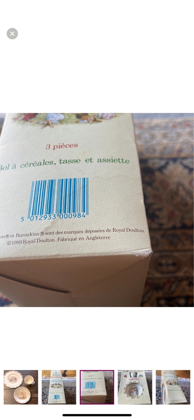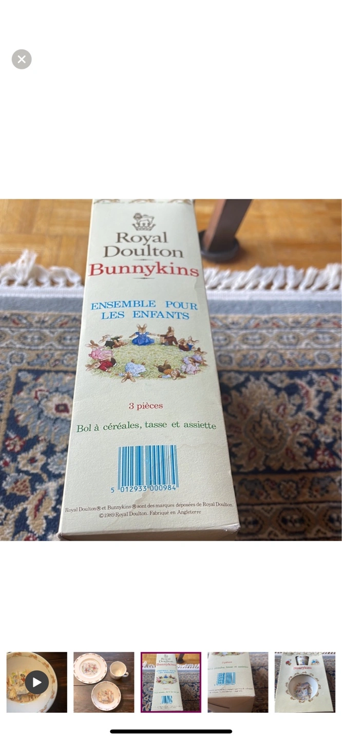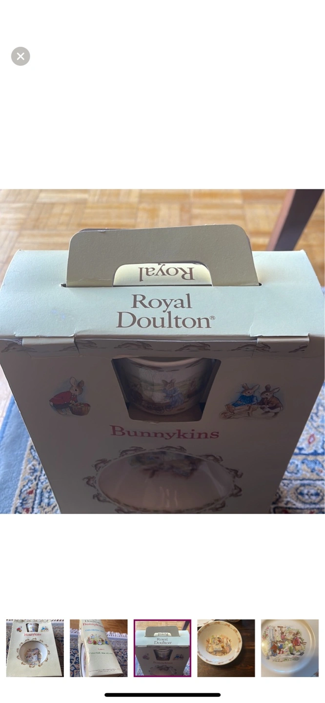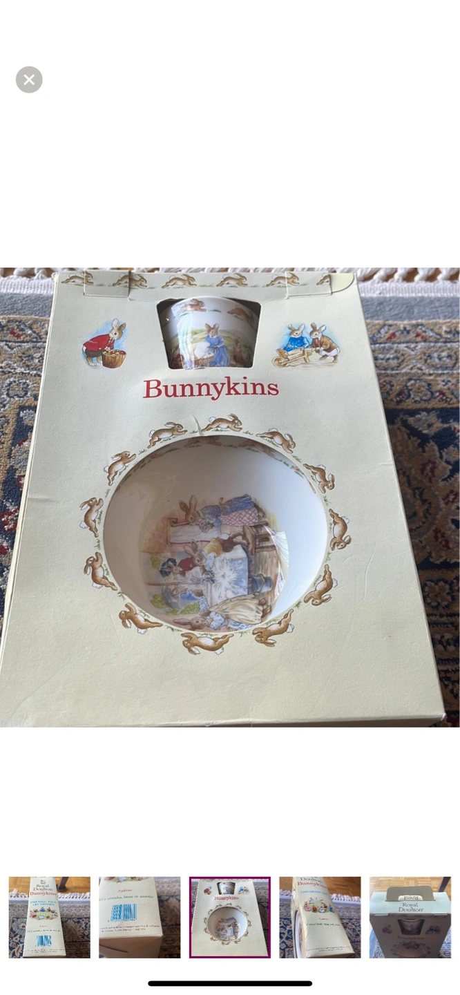 Adorable children's 3-piece set. Includes a plate, bowl, and mug. Features charming Bunnykins illustrations. New in box.