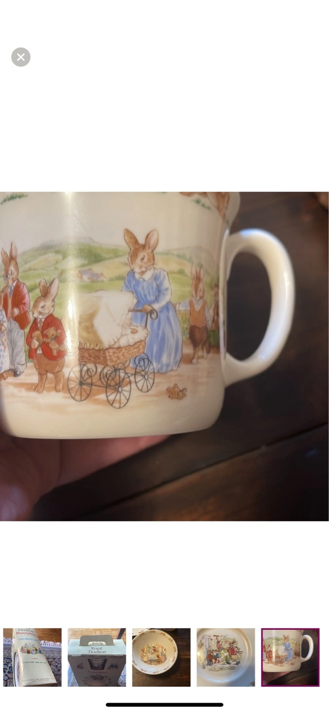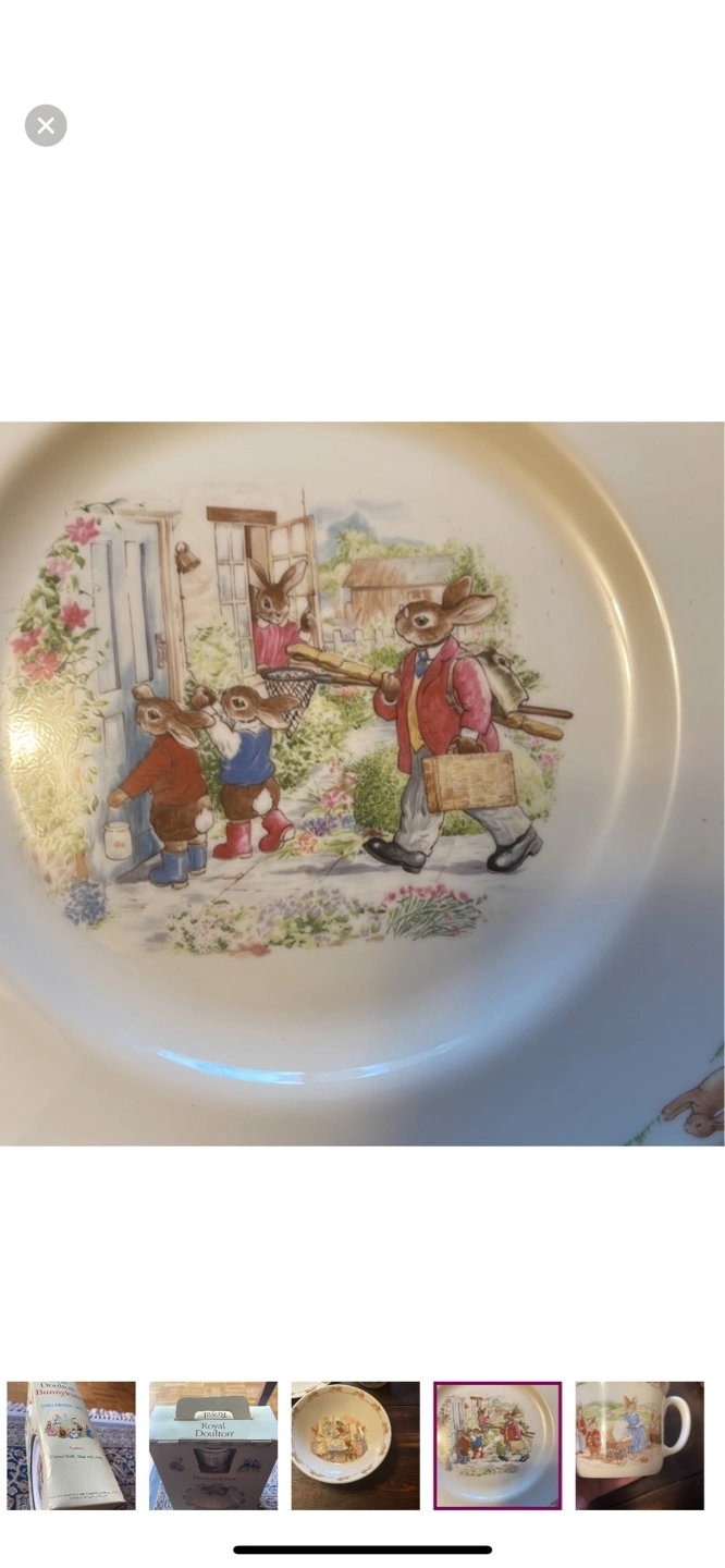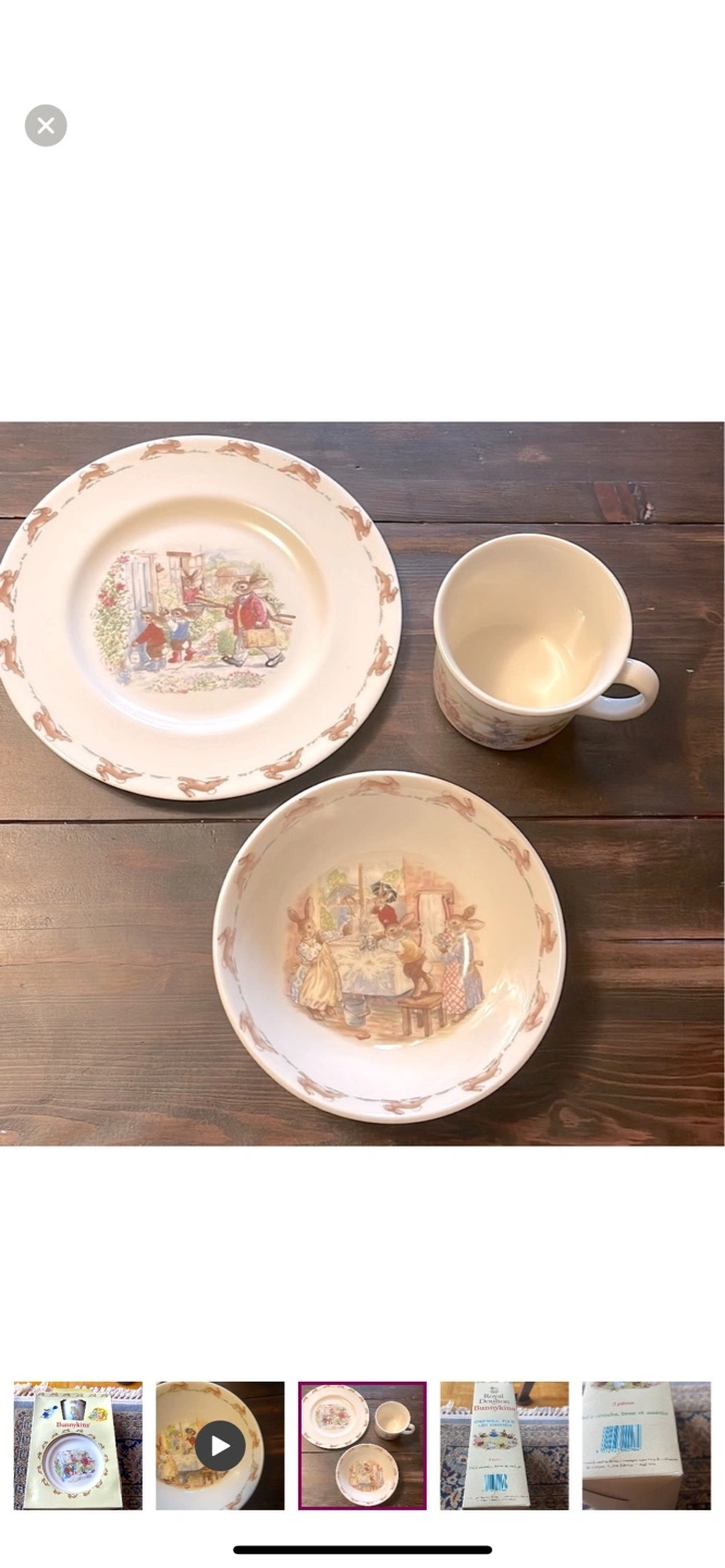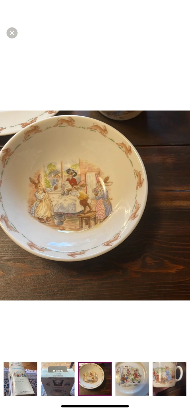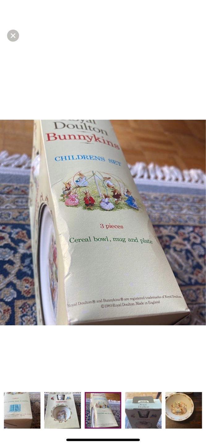 Adorable children's 3-piece set. Includes a plate, bowl, and mug. Features charming Bunnykins illustrations. New in box.
