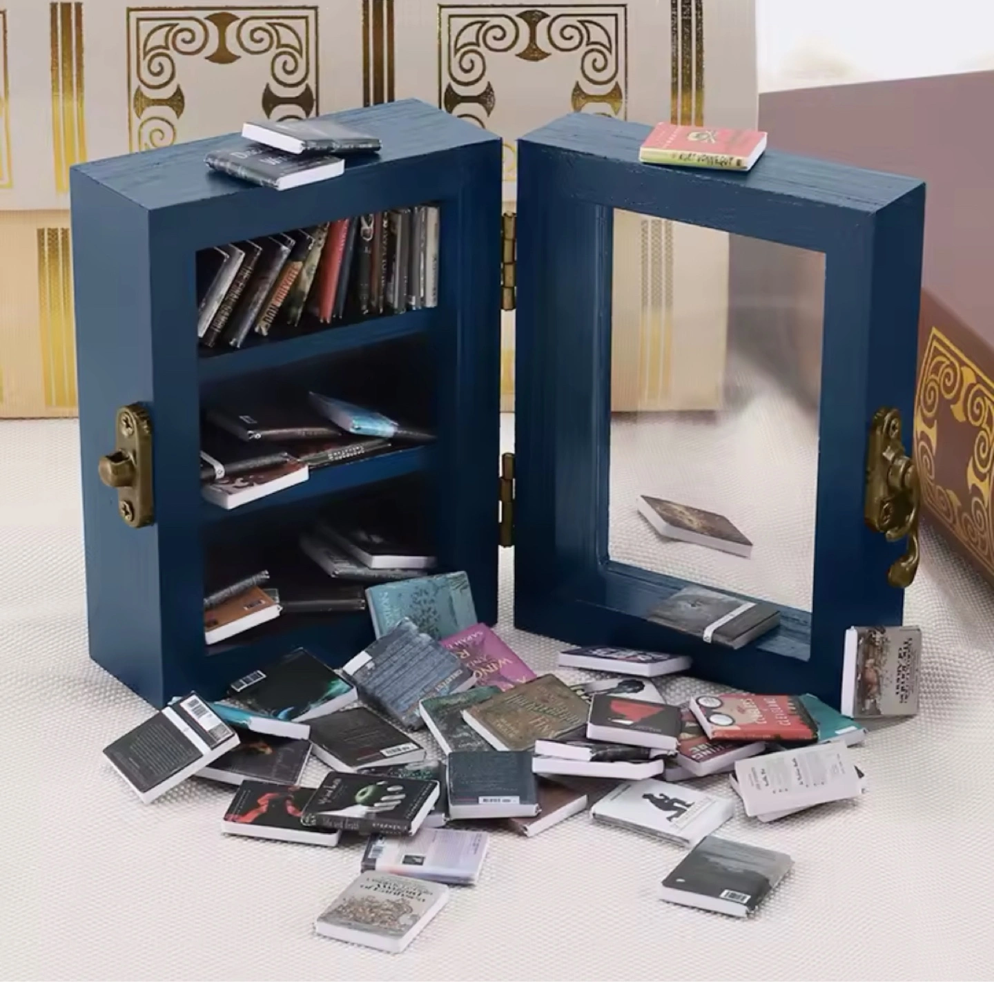Adorable miniature bookcase, dark blue finish. Includes many tiny books. Perfect for dollhouses or collectors.