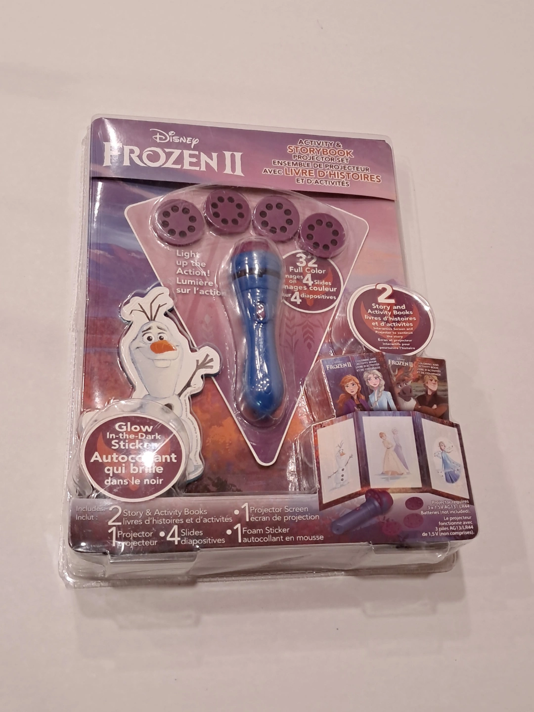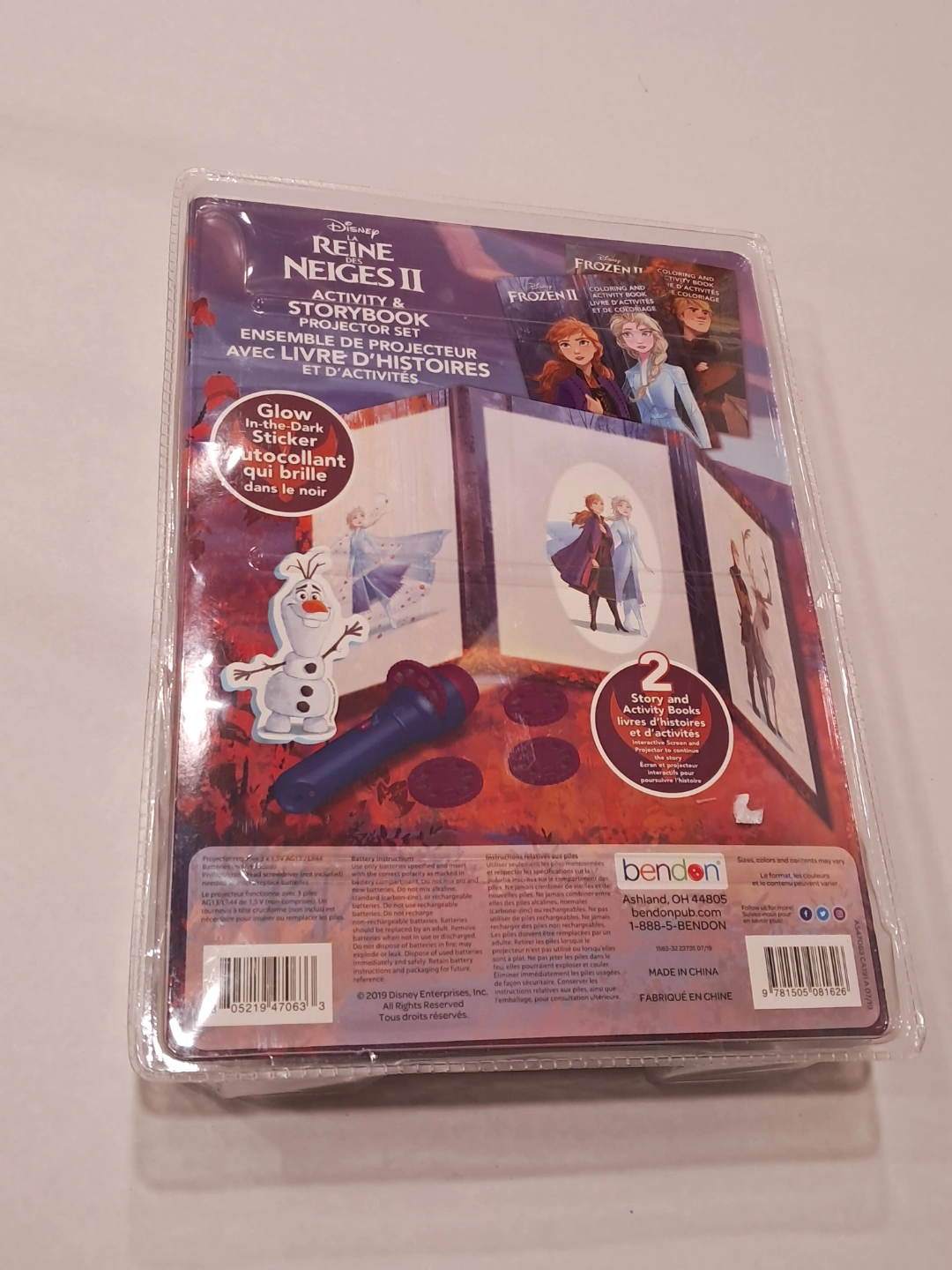 216New, unopened Frozen II projector set. Includes projector, storybooks, and glow-in-the-dark stickers. Four full-colour images. Fun for kids!