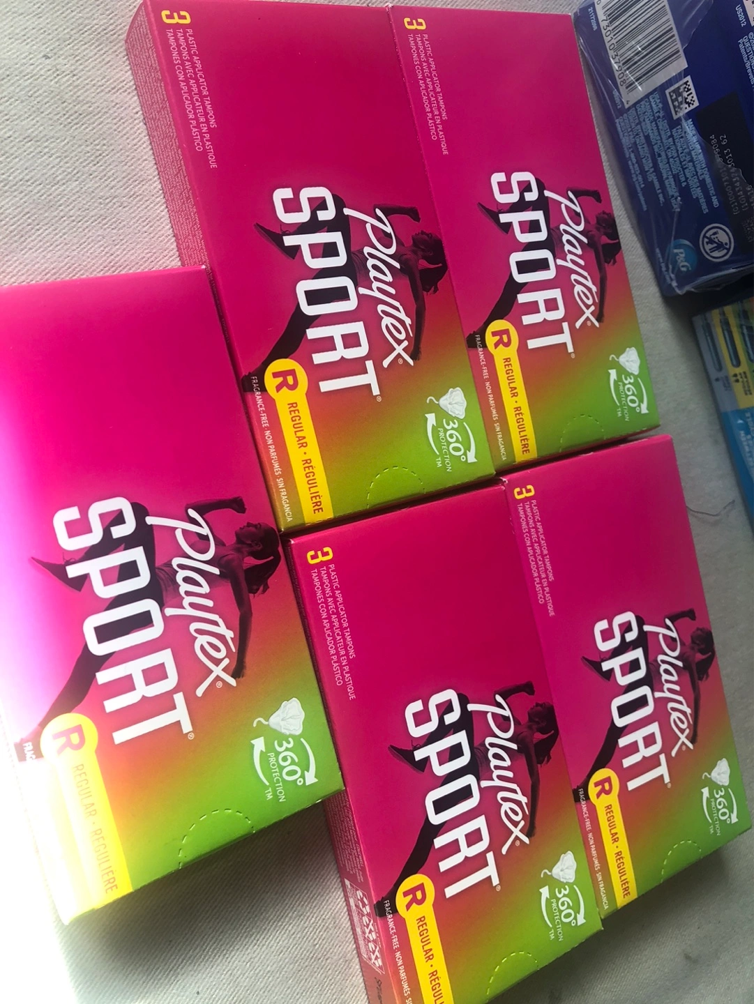 New, unopened packs of Playtex Sport regular tampons. Plastic applicators. Fragrance-free. 360° protection. Each box for $1