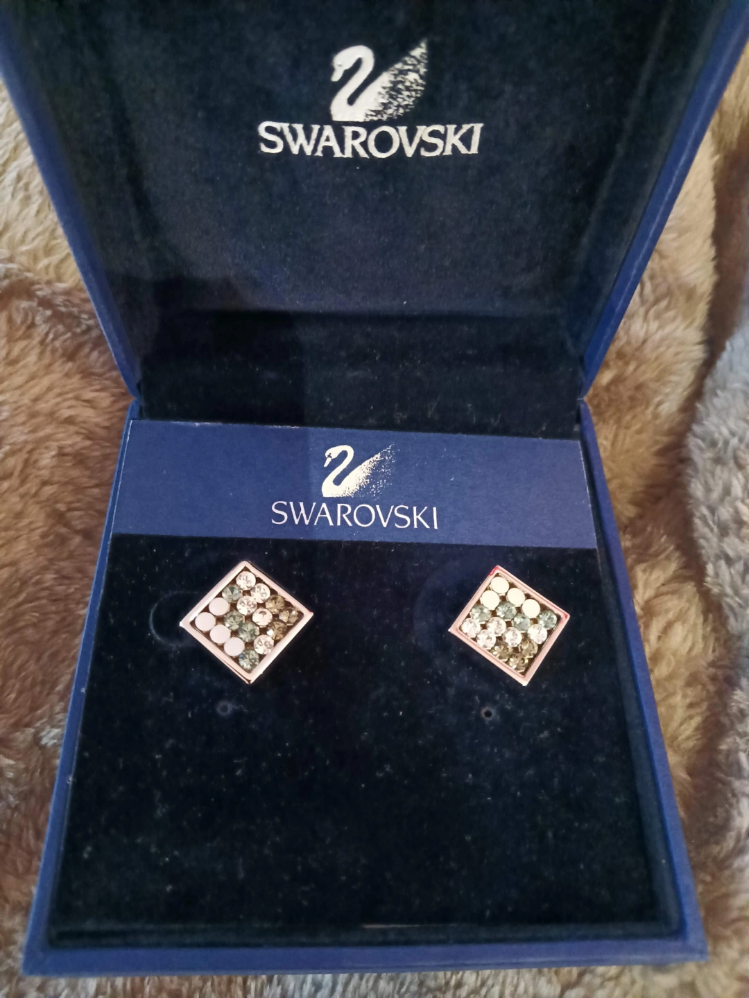 Pair of Swarovski crystal square stud earrings. Rose gold toned metal. Multicoloured crystals. In original box.