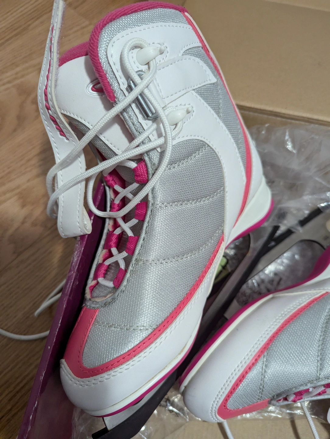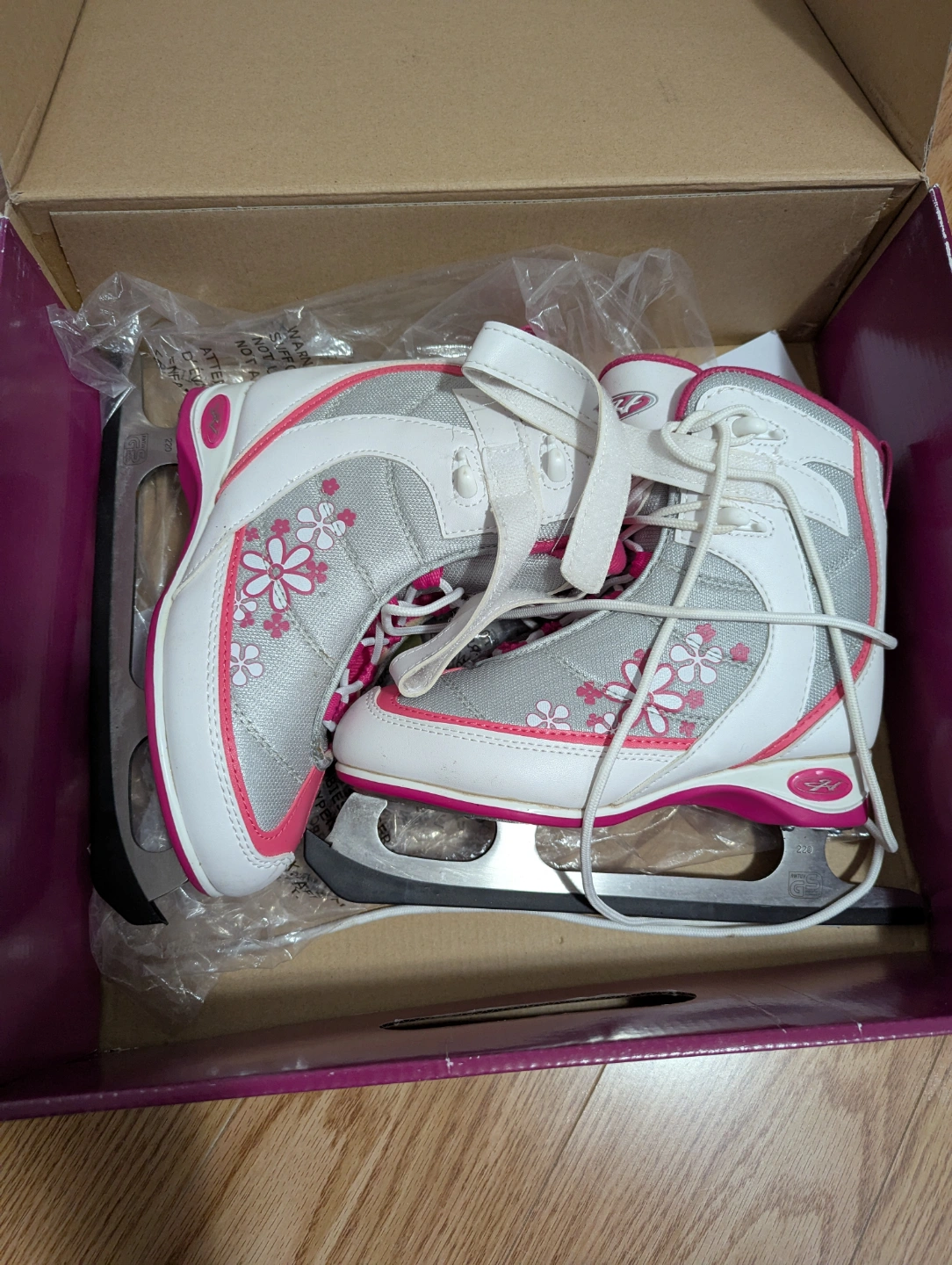 Girls' figure skates. White and silver with pink accents. Lace-up closure. Floral design. In original box. only used for 2 seasons.