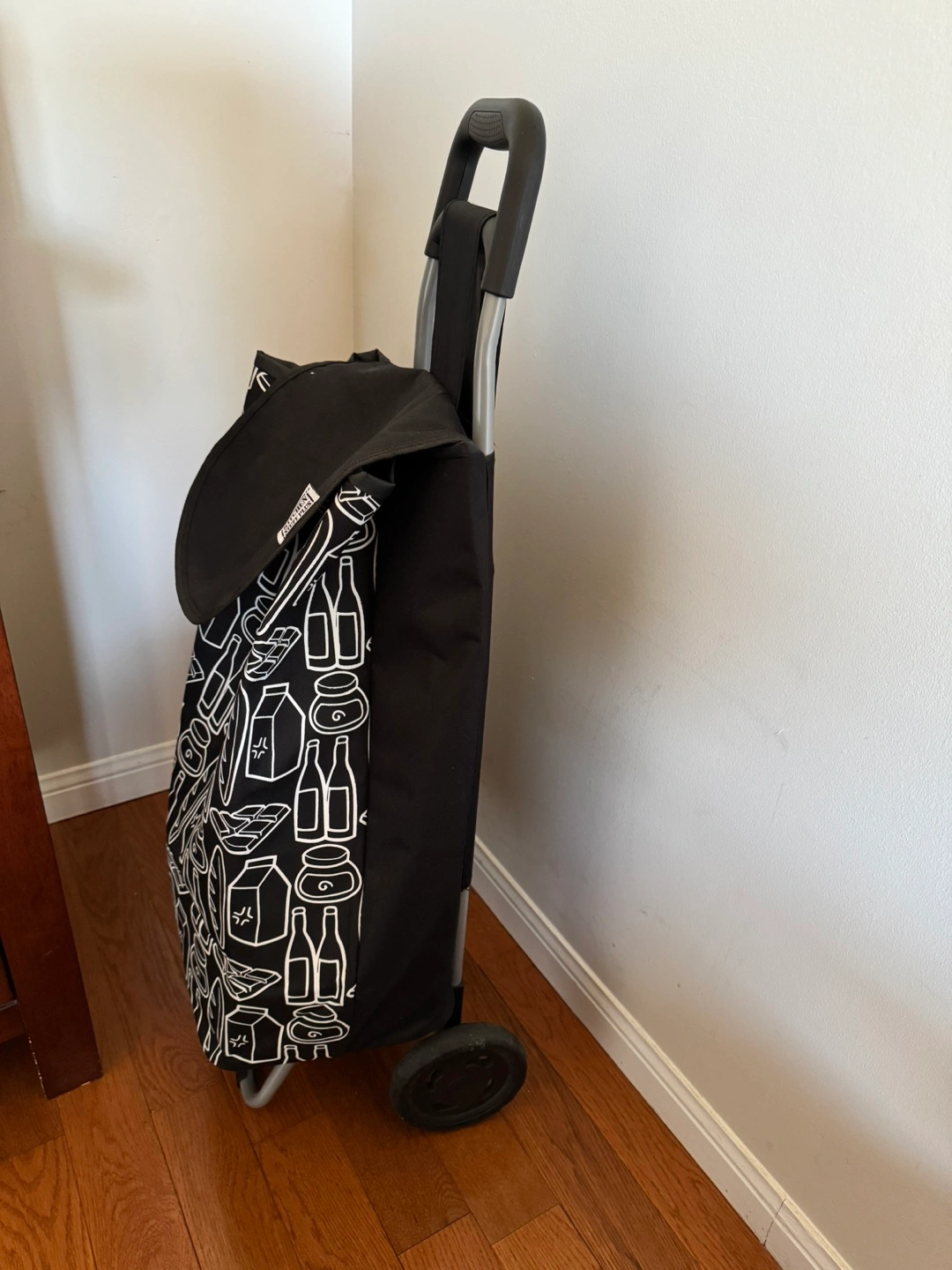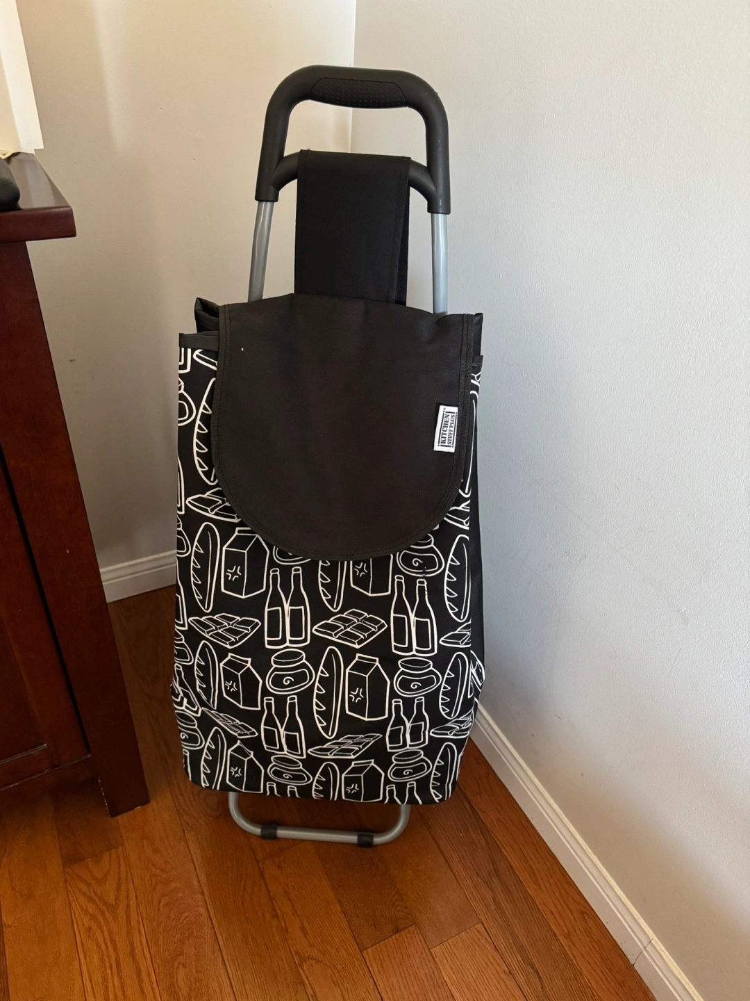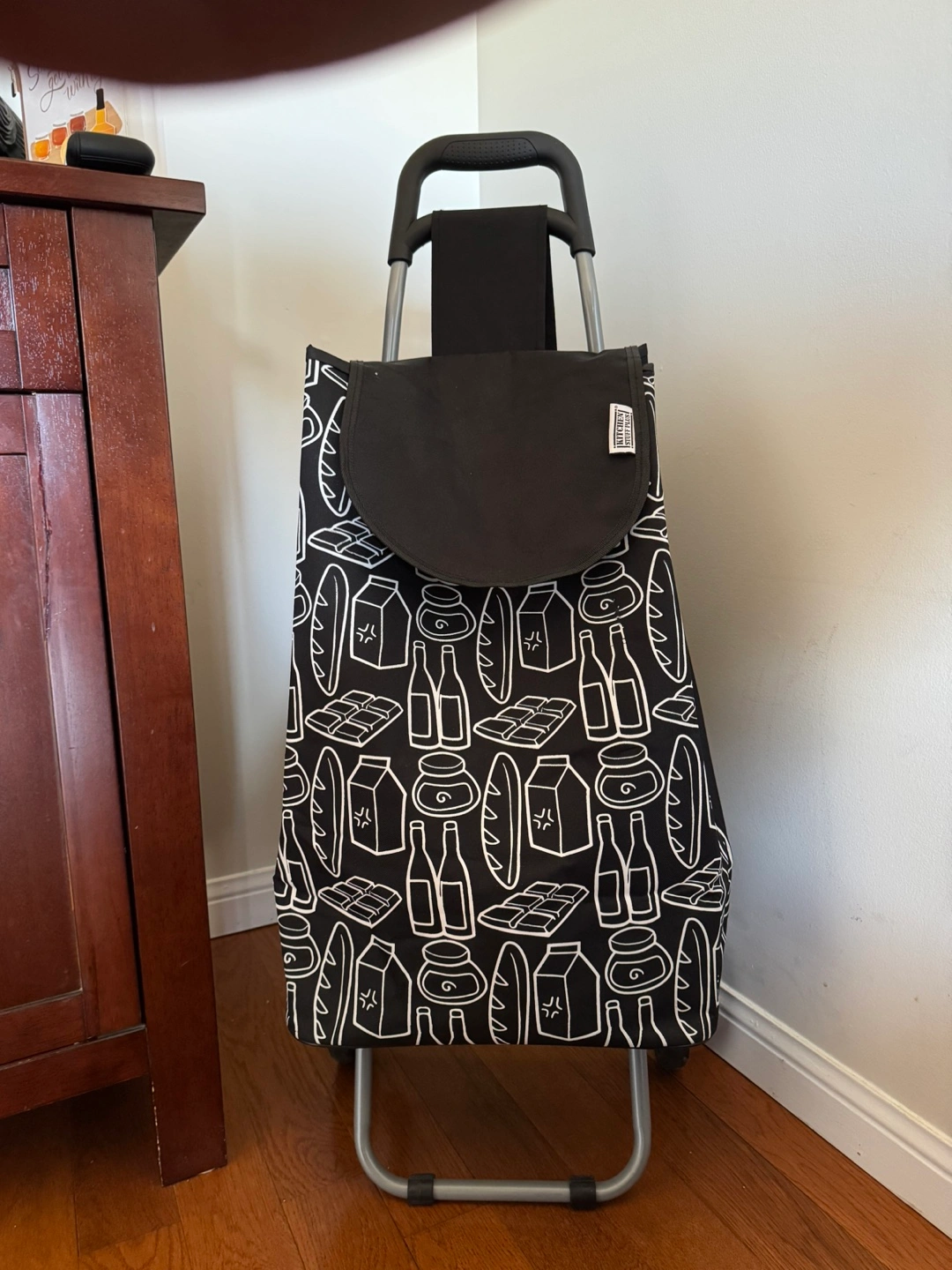 548Black and white patterned shopping cart. Features a foldable design and sturdy wheels. Great for groceries or other shopping needs.