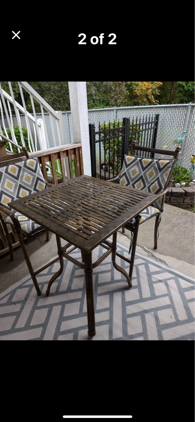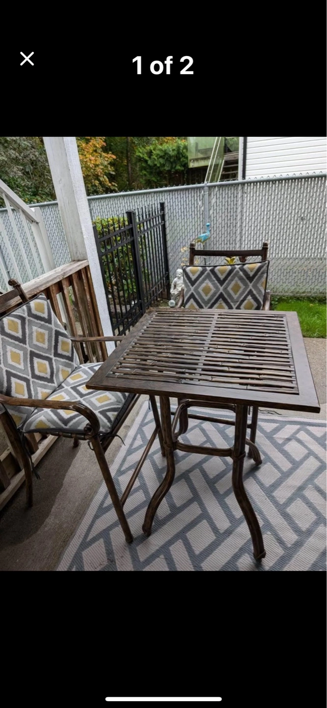 Buy & SellOutdoor Patio Bistro SetOutdoor Patio Bistro Set$130Small patio set. Square table, two chairs. Metal frame. Cushions included. Grey and yellow diamond pattern.WHERE TO MEET148 & 17View MapSELLERMelanieSunnyside281 review3 chats·1 favorites·287 viewsSEND CHAT TO SELLERHi Melanie! I’m interested in your listing.Hi Melanie! I’m interested in your listing.Get the Karrot app to chatSign In to chat