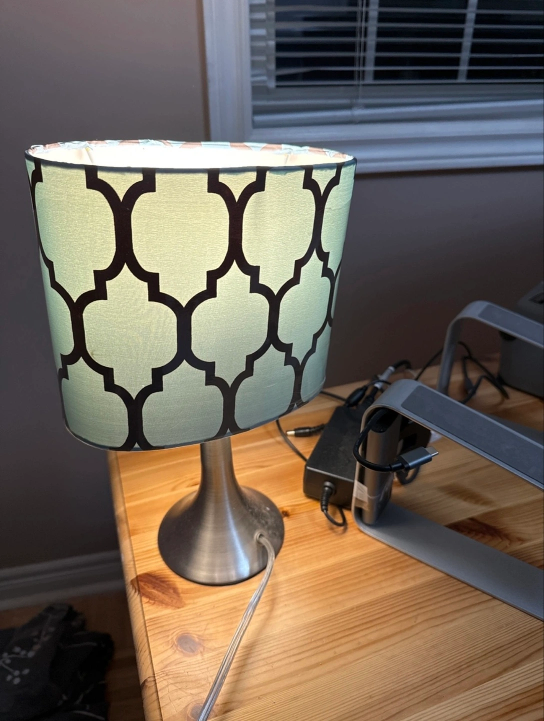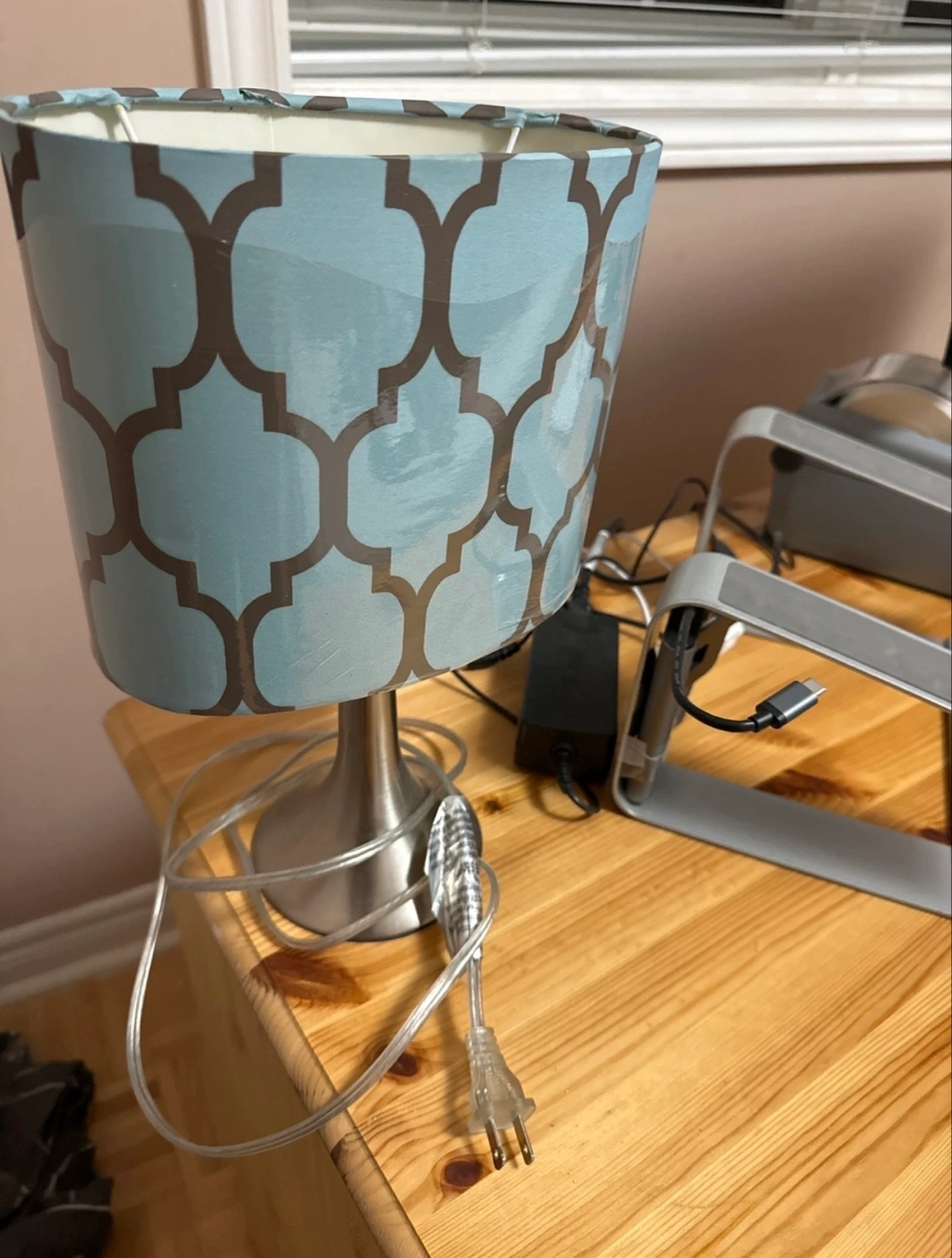 548Small table lamp. Features a brushed silver metal base and a light teal fabric shade with a geometric pattern. Includes power cord. Perfect for a bedside table or desk.