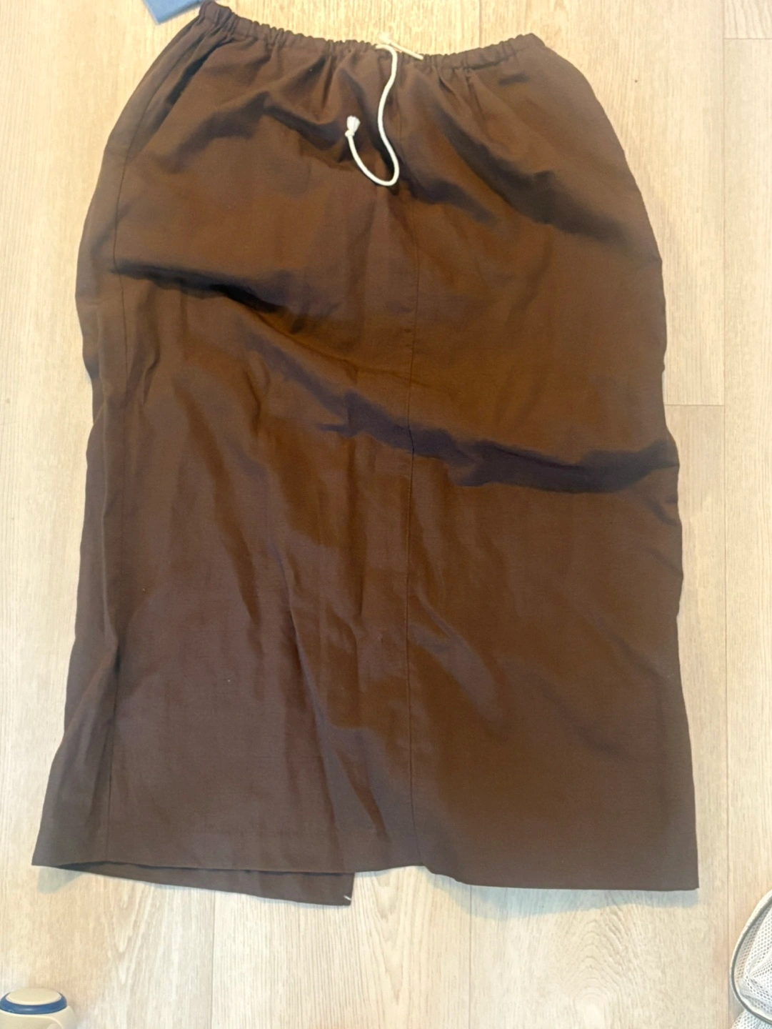 Logn-midi brown midi skirt. Features a drawstring waist and side slit. Relaxed fit.
