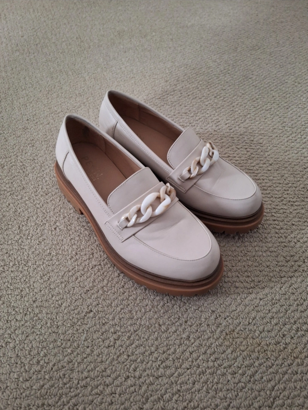 Women's loafers. Cream faux leather upper. Chunky rubber sole. Decorative chain accent. Size 10 wide-width.